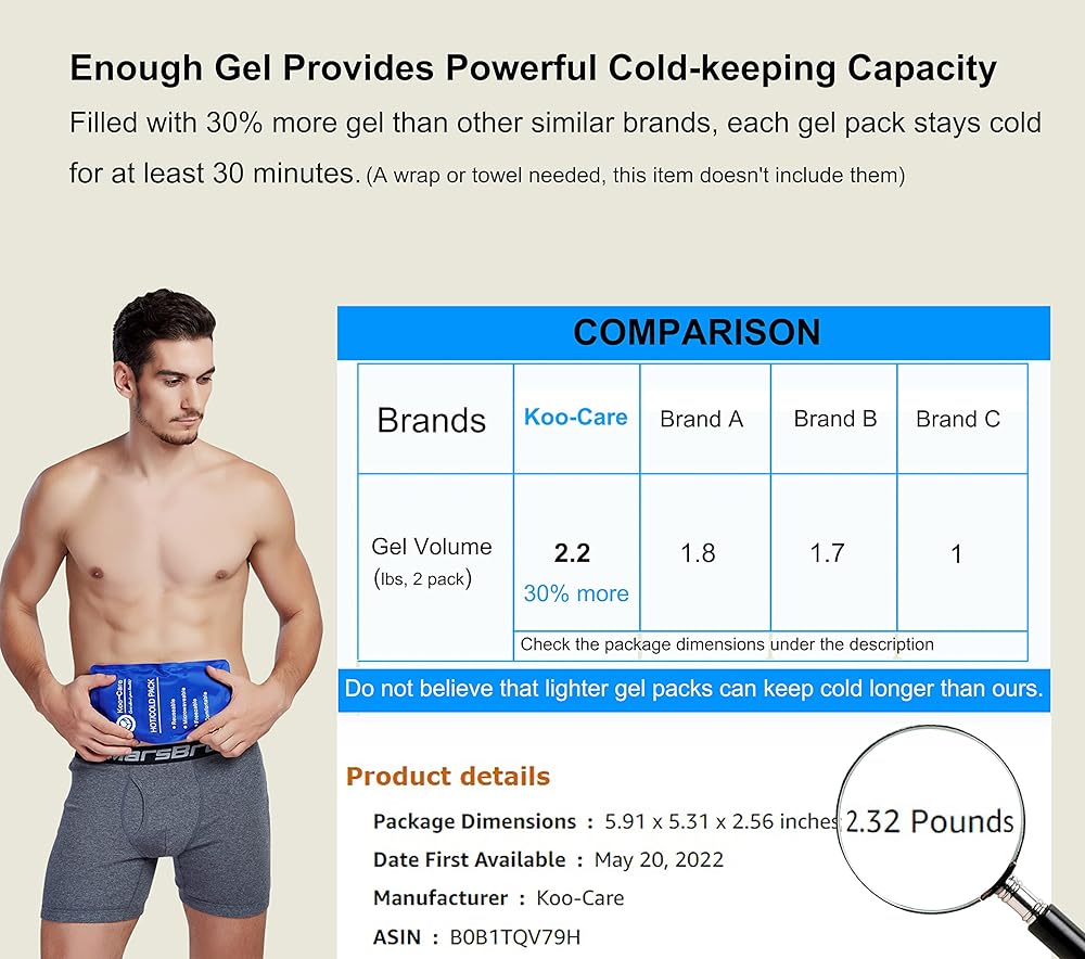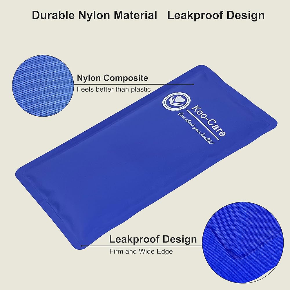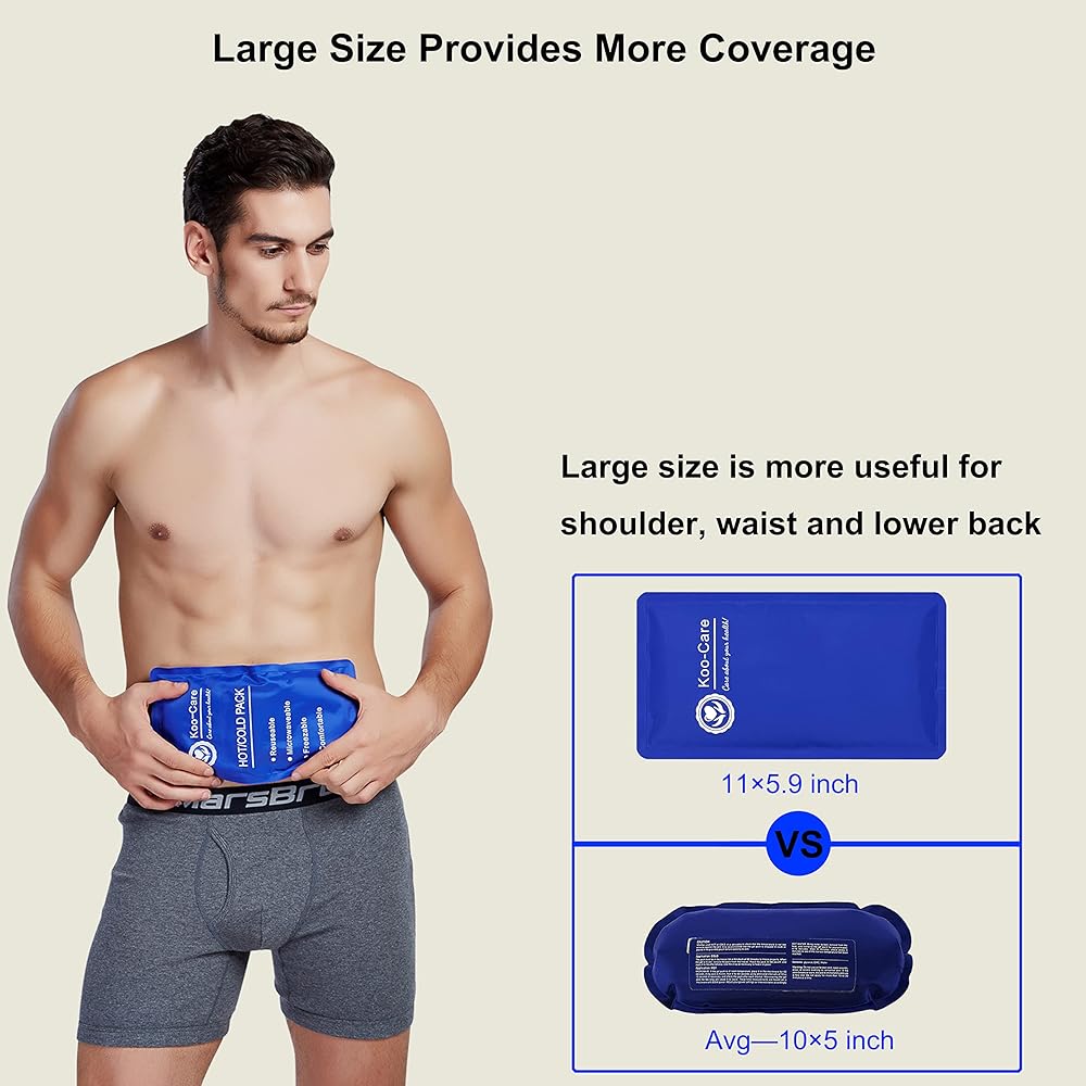 Extra-Large Size / 2 Pack. Compared to the general small ice packs, this Koo-Care XL gel pack (11'' x 14'') can cover a wider area. Filled with enough 2.2 lbs of gel, each ice pack has a powerful ability to keep cold or hot longer. The unique design of this cold pack makes the gel distributed evenly and the gel will not easily clump together unlike other large cold packs. This 2-pack set can double your usage time, one for use and the other one in the freezer ready for use.