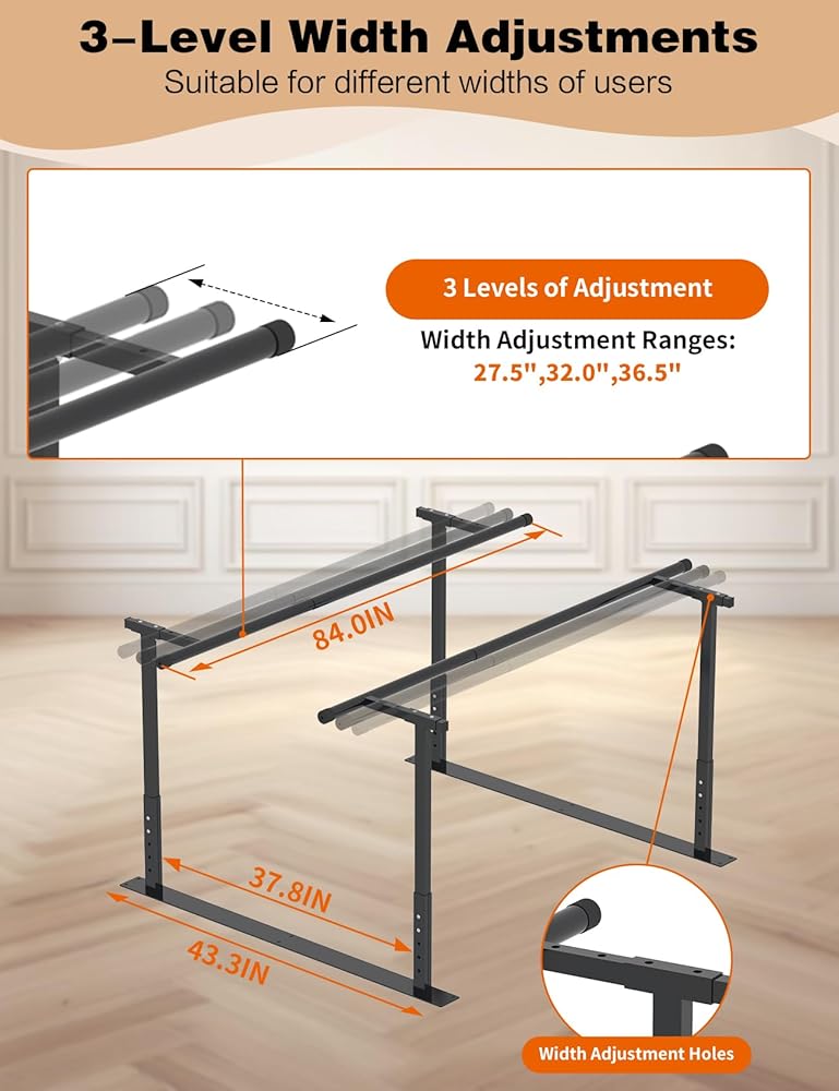 Adjustable height & width design: The parallel bars for physical therapy feature four heights(43.5“, 46.0”, 48.5“, 51.0”) and three widths(27.5", 32.0" ,36.5"), enabling personalized rehabilitation setups tailored to individual home therapy needs.