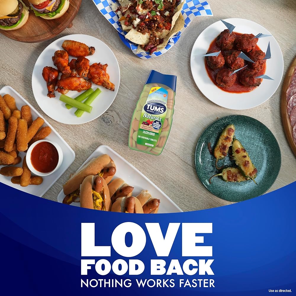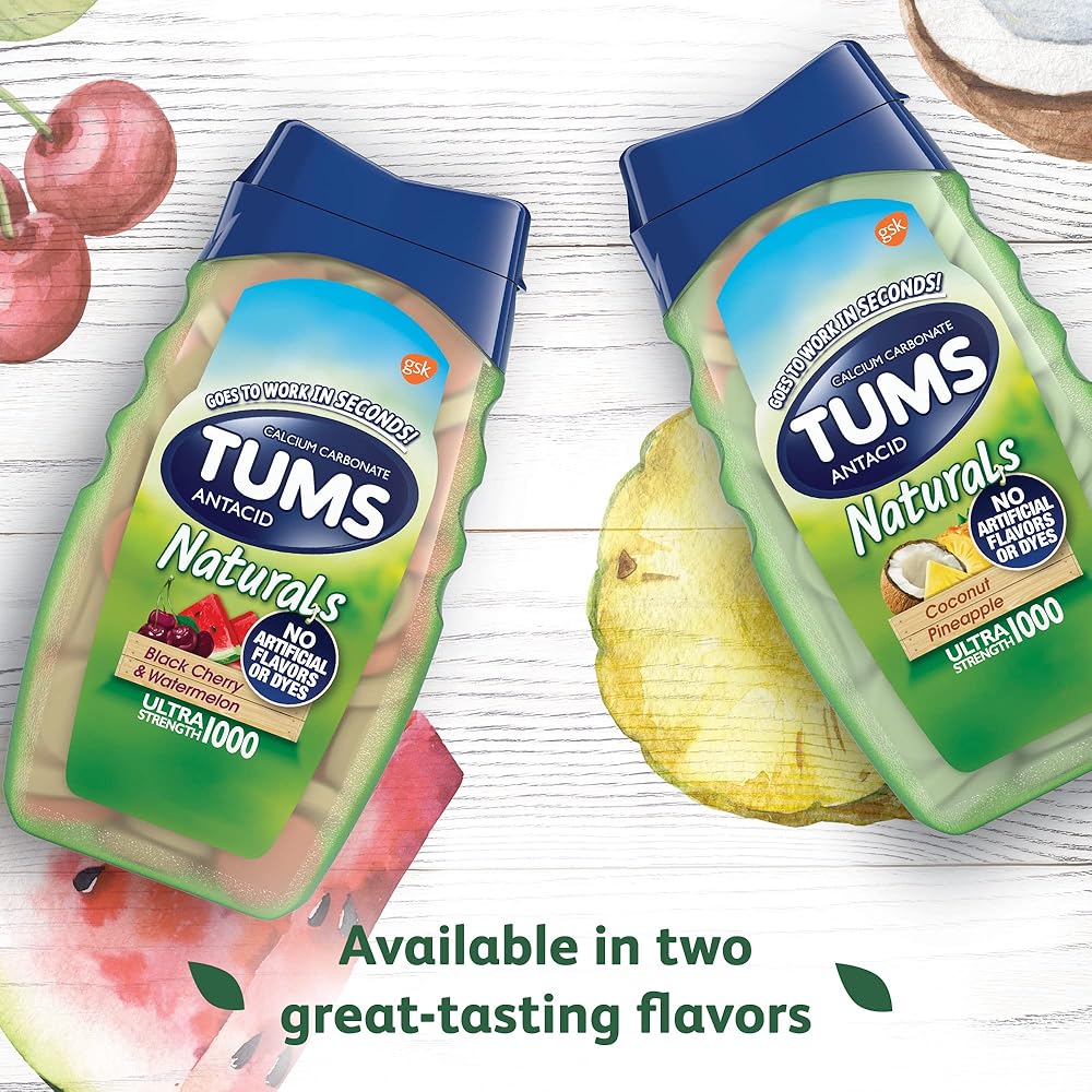 Suffer from heartburn? Fast, effective relief is here for you thanks to TUMS. TUMS Naturals Ultra Strength Antacid Chews provide fast-acting, ultra strength heartburn relief. Free from artificial flavors and dyes, these heartburn tablets are non-GMO and gluten-free. Containing 1000mg of active ingredient calcium carbonate, TUMS Naturals Black Cherry & Watermelon Antacid Chewable Tablets provide ultra strength heartburn relief. It goes to work in seconds to neutralize stomach acid and relieve heartburn, acid indigestion and upset stomach associated with these symptoms. This TUMS heartburn medicine tastes great too, giving you more flavor options than anyone else. These new ultra strength antacid chewable tablets are available in Black Cherry & Watermelon. And the bottle and cap are 100 percent recyclable. Try them today to join the millions of people who have successfully treated their heartburn with TUMS antacids. Today, TUMS antacid products are available in a whole range of great-tasting flavors and types. From TUMS Chewy Bites Cooling Sensation, which provides relief with every bite, to the deliciously smooth and tasty TUMS Smoothies�there's a TUMS for everyone.