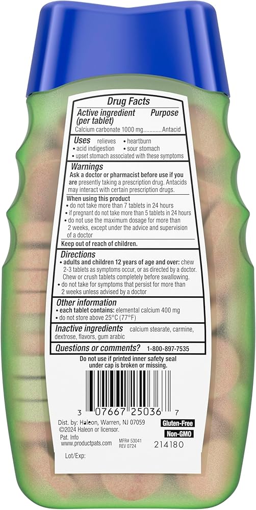 Gluten free: Chewable antacid tablets with no artificial flavors or dyes and the active ingredient calcium carbonate