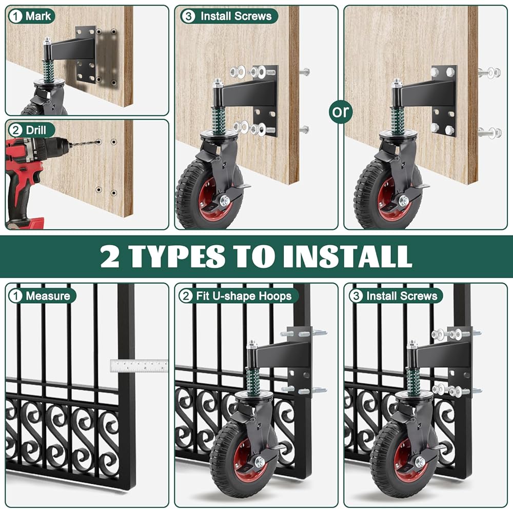 TWO INSTALL METHODS: Compared to the other fence gate wheels in the market, our fence gate wheel can be installed in wooden doors or metal doors. Attached the U-shape and screws and wrench, gloves to help install.