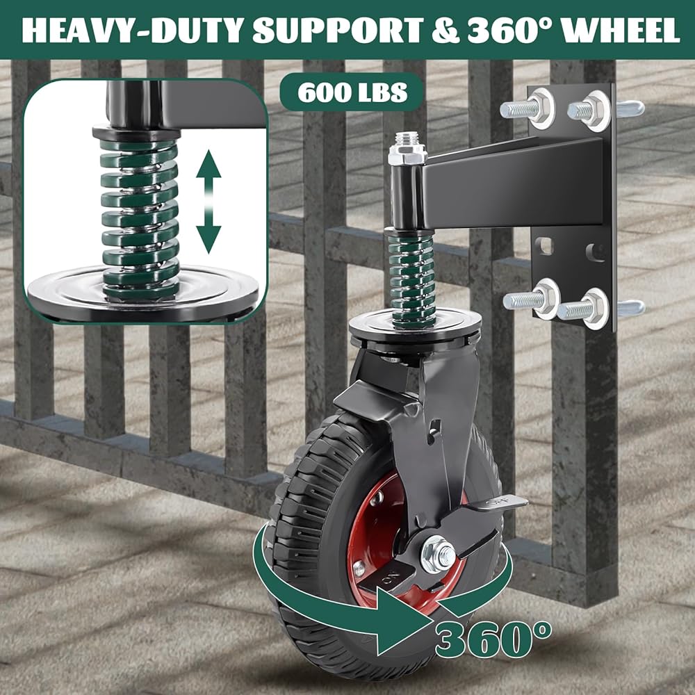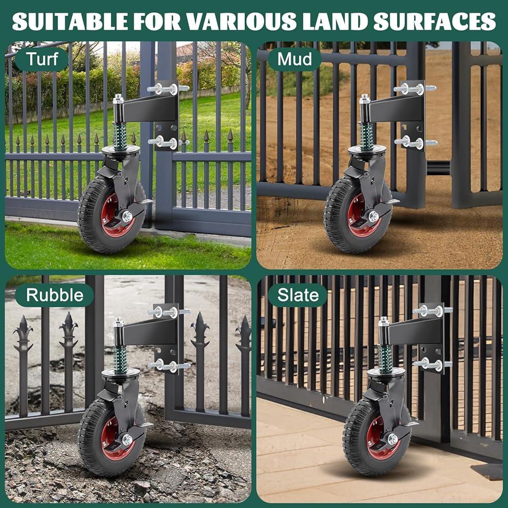 VARIOUS SURFACE TO USE: The fence gate wheel was design by a high strength tires and sturdy springs, with high ground adaptability, can work smoothly on various floors, such as turf, mud, rubble and slate surface.