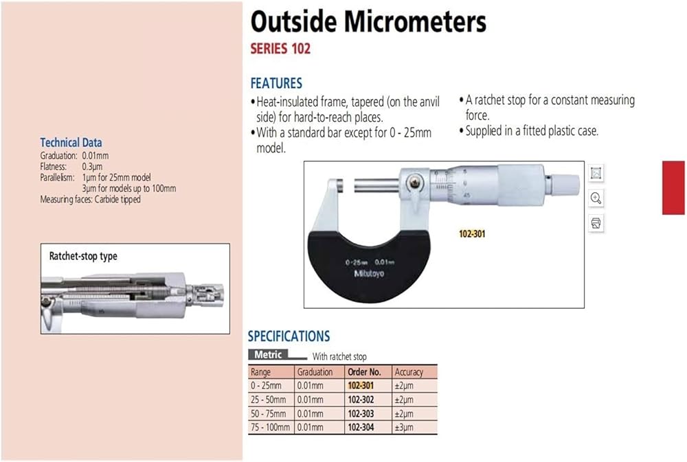 Outside Micrometers,102-301 0-25mm,102-302 25-50mm,Graduation 0.01mm(102-301)