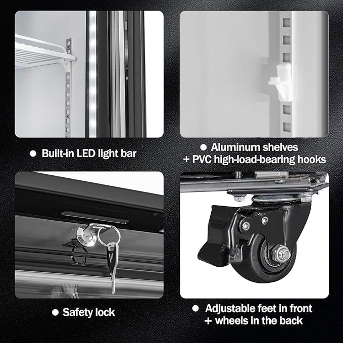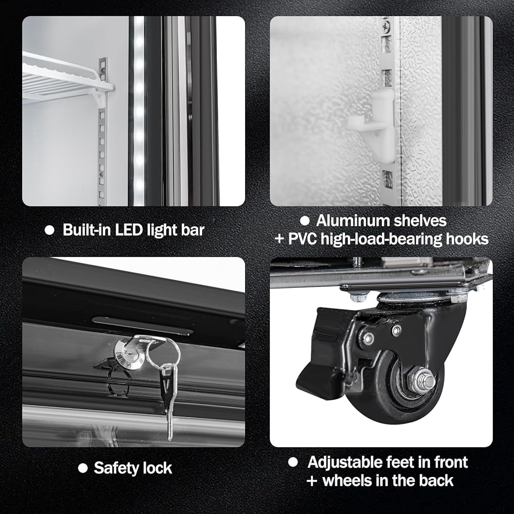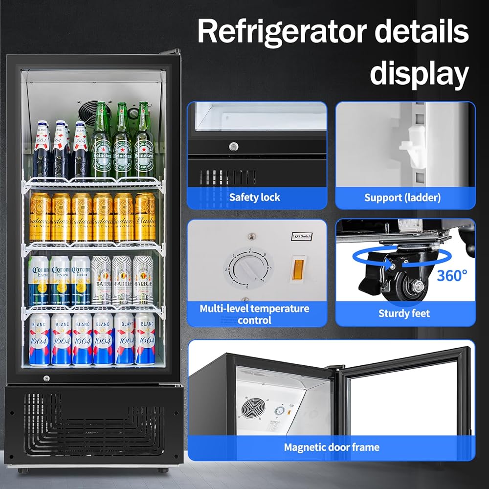 Premium Features: Our commercial beverage fridges feature durable double-layer tempered LOW-E glass doors that block sunlight while maintaining temperature. Drink fridge details include: energy-saving LED interior lighting, multi-level temperature adjustment knob, security lock, magnetic door seal