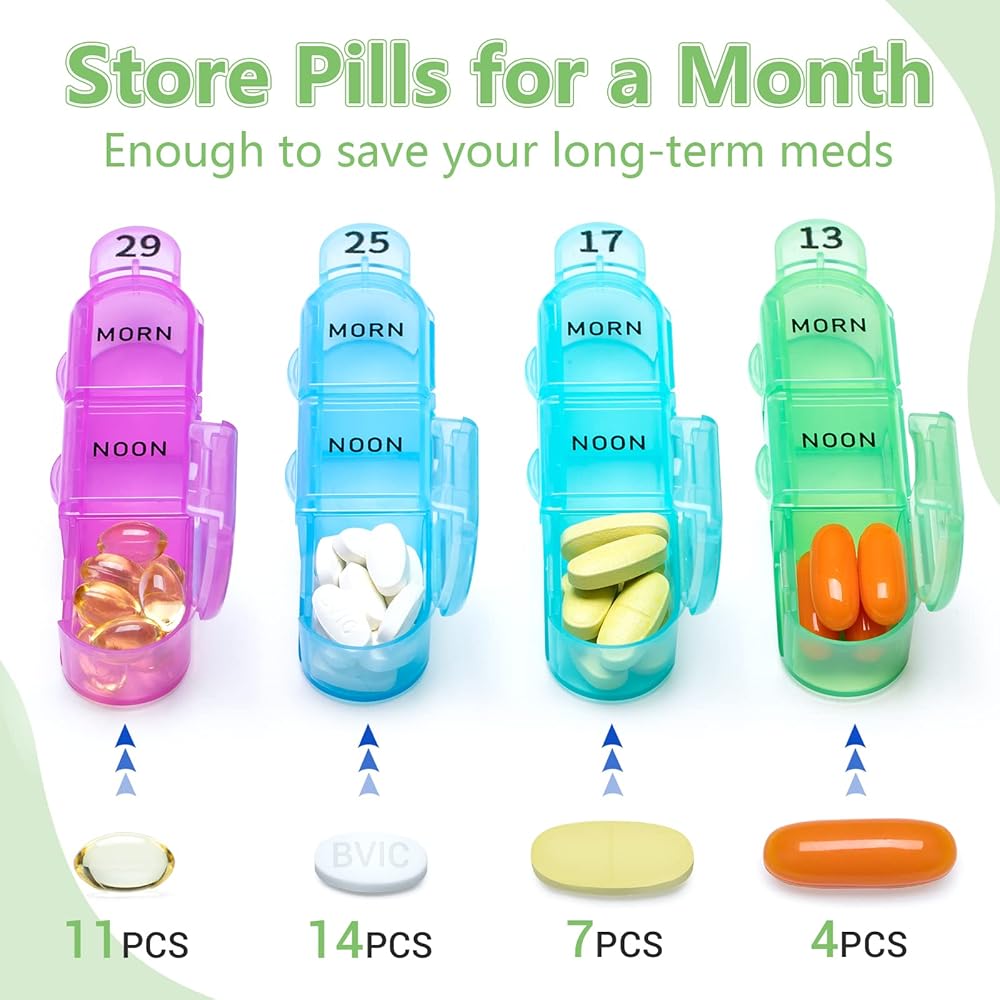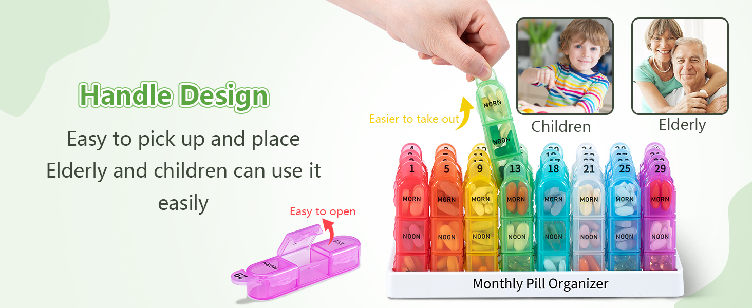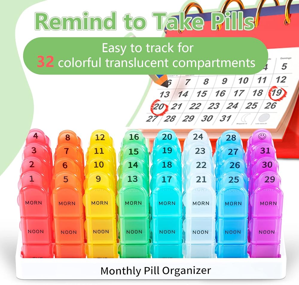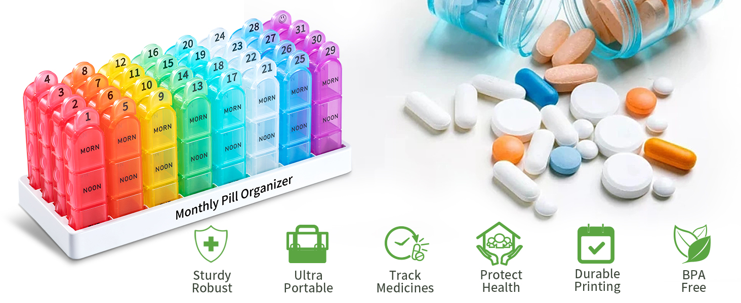 🧡[Morning-Noon-Night Compartments] Our upgraded 31 day monthly pill organizer features 32 numbered colorful translucent compartments that easy to check if you have taken your pills for the day. Each individual pill box organizer is small and lightweight that is ideal for carrying and tracking daily medicine.