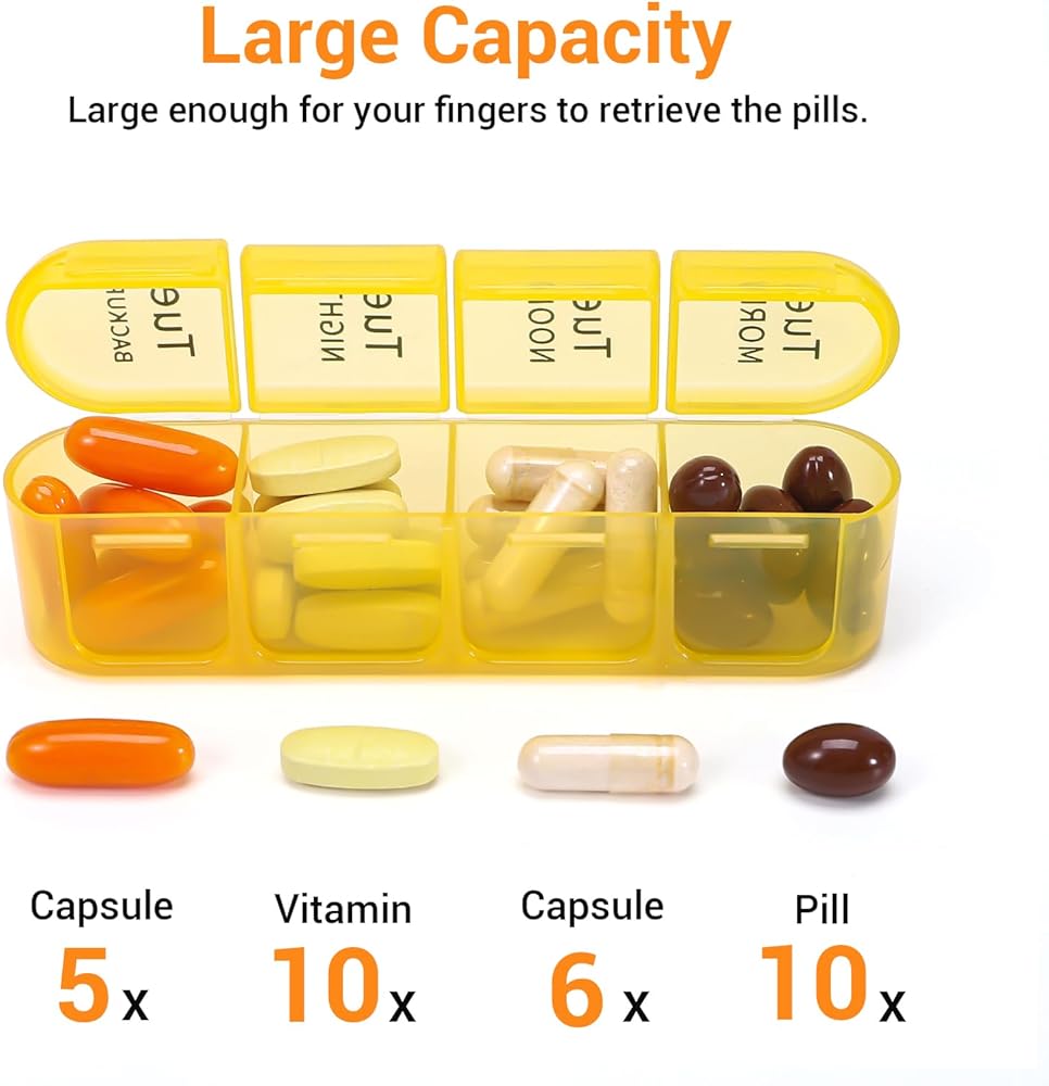 [Pill Organizer 4 Times a Day] Our weekly pill box 4 times a day has 7 detachable medication organizer for a week, total 28 large compartments with Morn-Noon-Night-Backup. The color-coding pill holder helps you track your daily pills, and the detachable design allows for easy grab-and-go use.