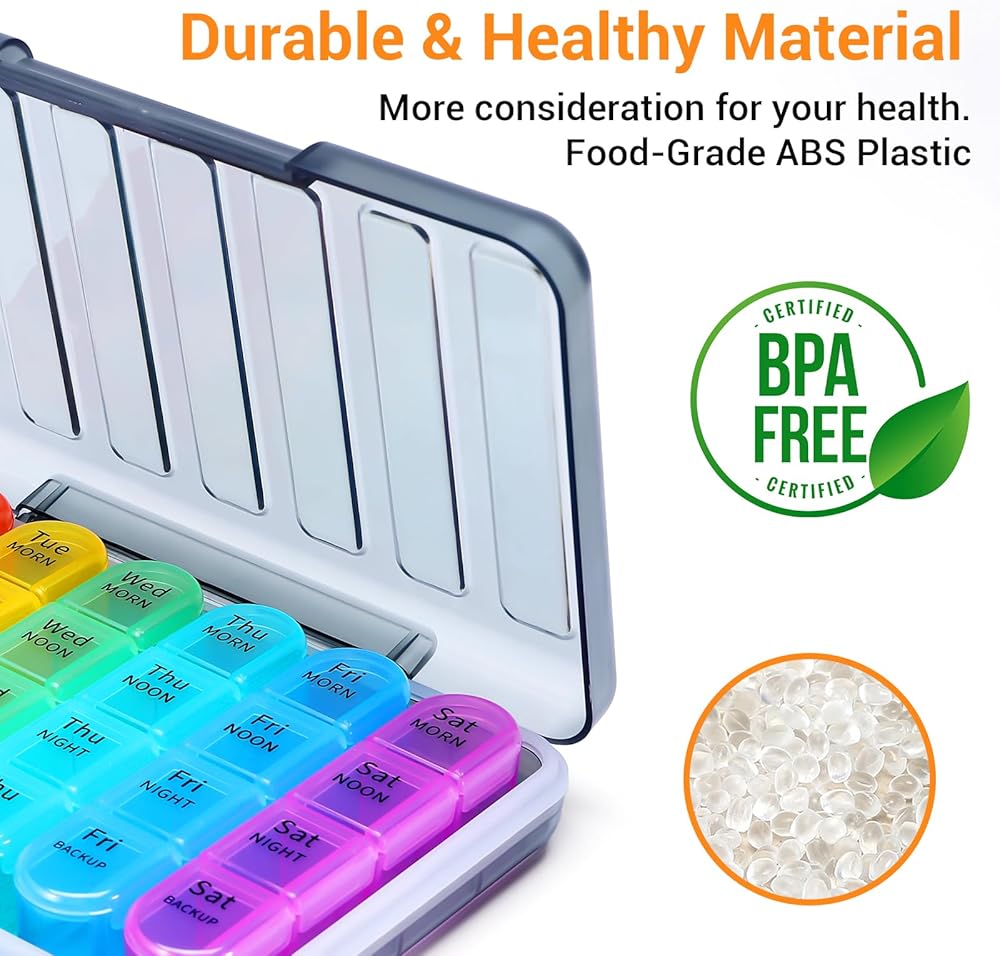 [Rainbow Designs Printing]The weekly pill organizer top of each day is marked with the eye-catching letters and printed using the latest 3D printing technology. The icons on the 7 Day Pill Box Organizer have been tested to not rub off after over 6,000 uses. The large pill organizer weekly vitamin box keeps track of your medication and keeps you on schedule.