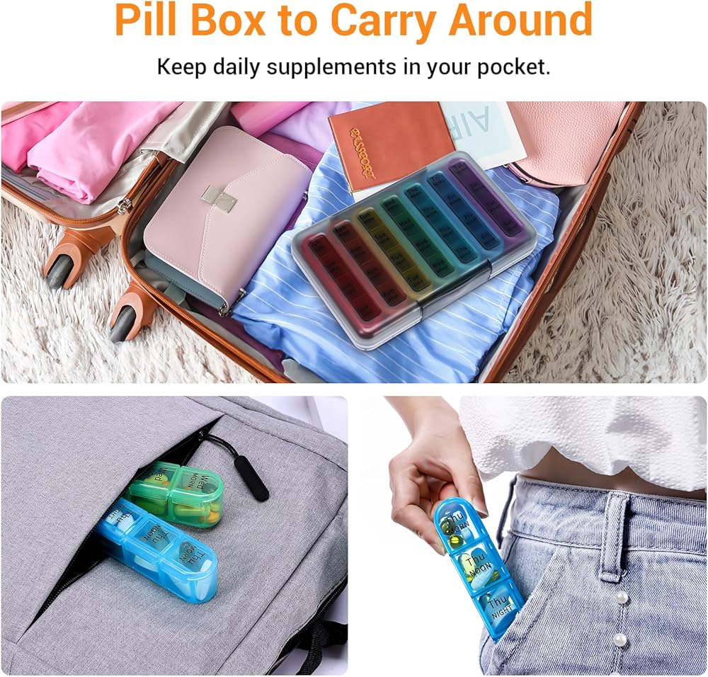 [Easy to Carry & for Traveling] The weekly pill organizer has 7 separate daily pill box organizers to carry individually in your pocket, purse, handbag, backpack, or suitcase, very convenient for a trip. The reliable lock mechanism on the snap-on lid keeps your pills secured, no need to worry about spilling pills all around.