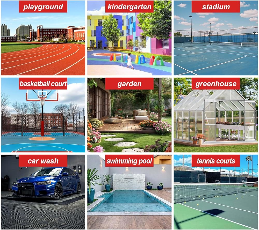 MULTI-SPORT & MULTI-SURFACE VERSATILITY:Install these interlocking tiles over grass, concrete, or asphalt for sports courts, playgrounds, or kindergarten areas. Ideal for stadiums, schools, ships, garages, pools, and spas—anywhere non-slip, weatherproof flooring is needed