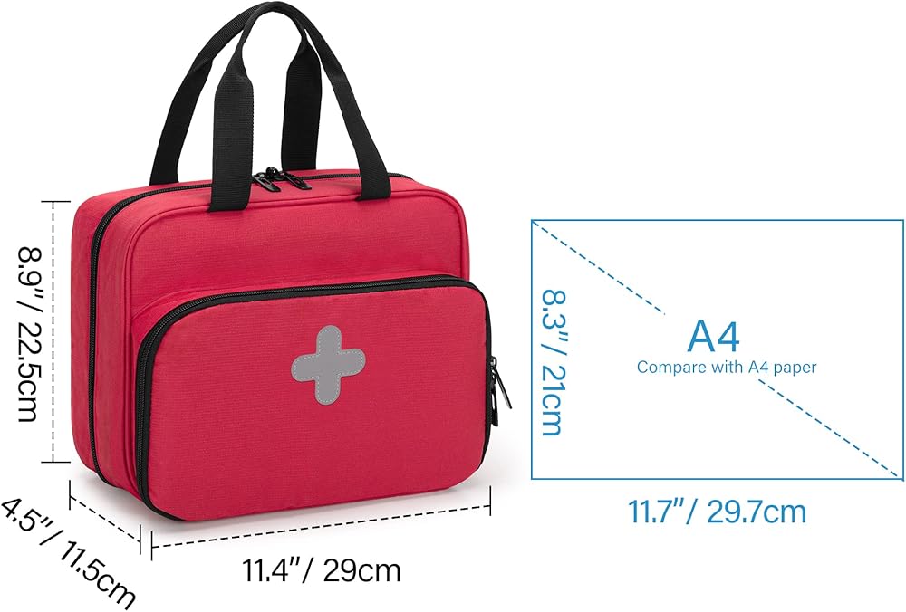 WELL MADE: Dimensions 11.4 x 4.5 x 8.9 inches. Compact size keeps all your pill boxes, vials, vitamins, supplements in one place. Reflective strips for easy identification at night. Back transparent window for holding emergency info card.