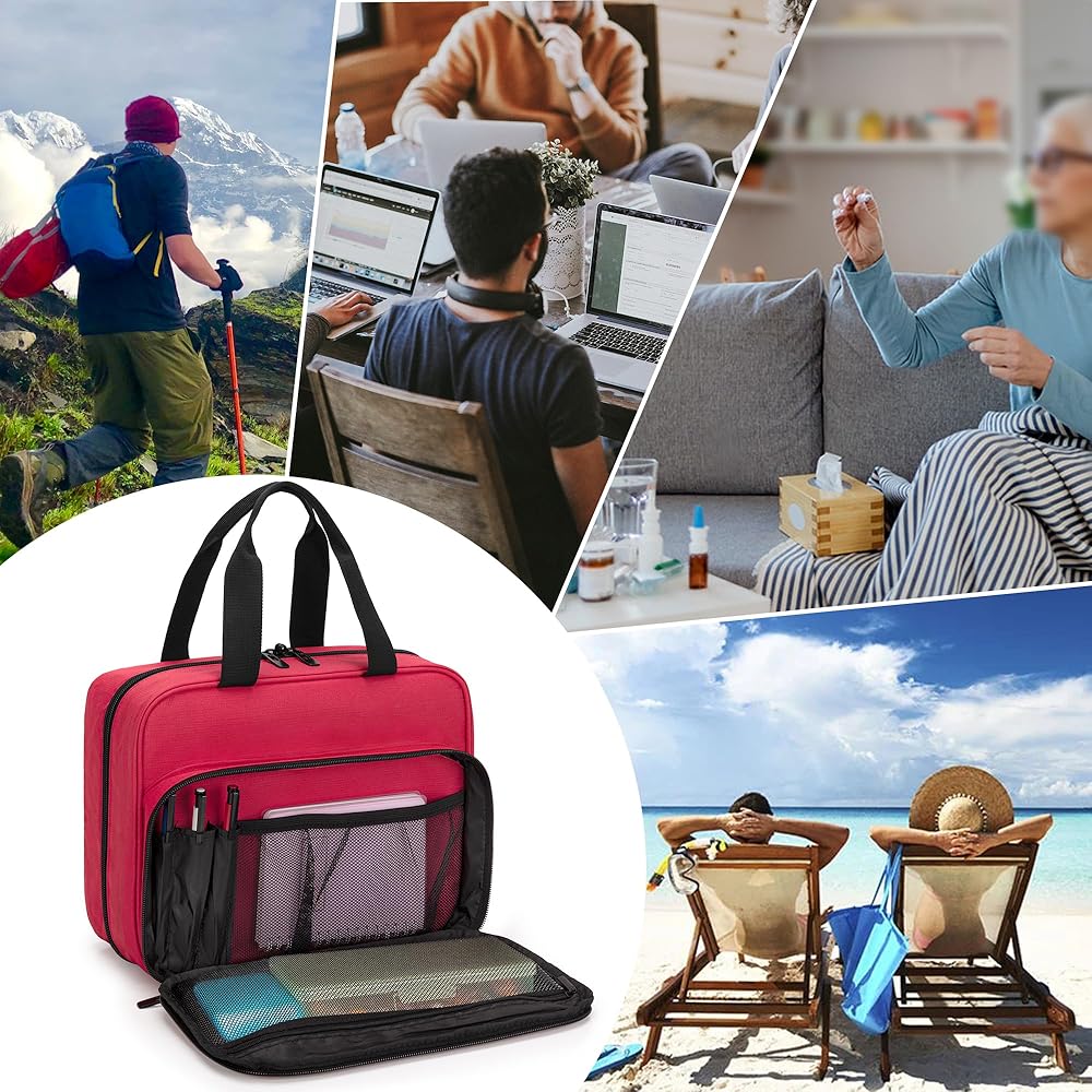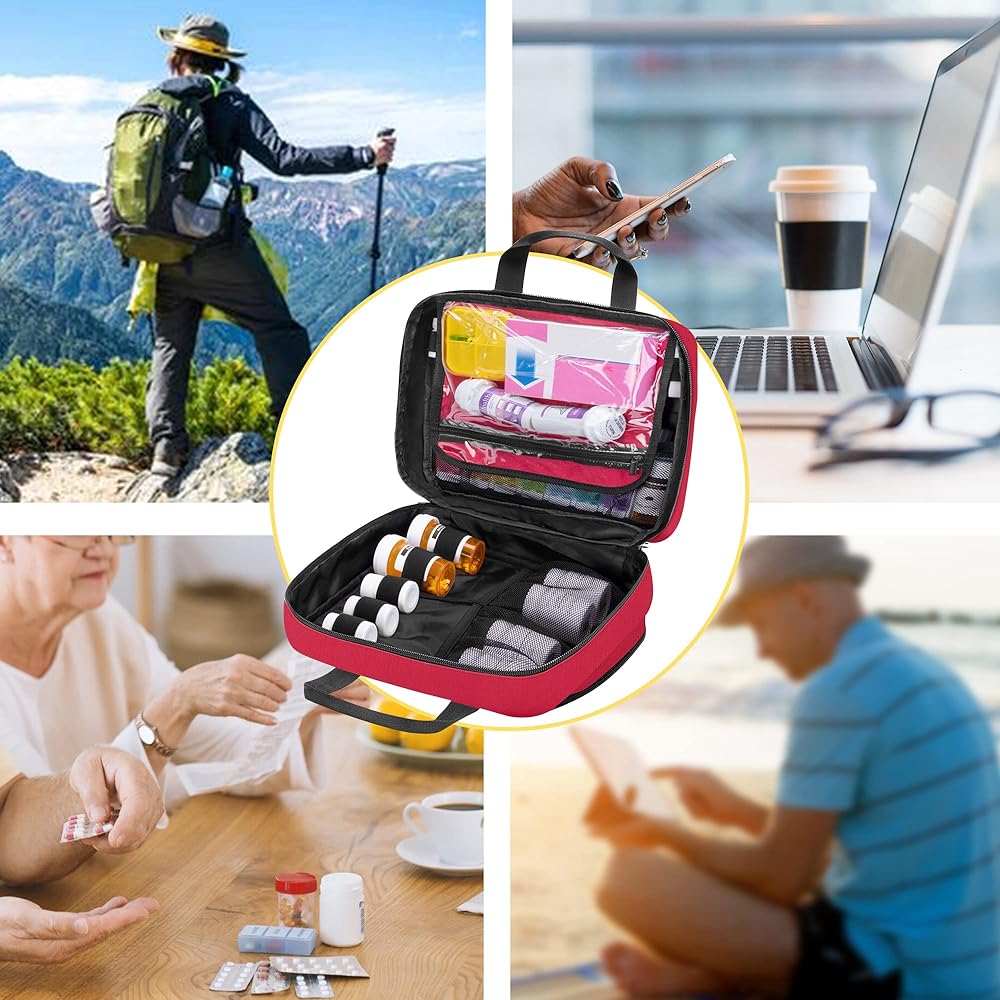 MEDICINE BAG FOR TRAVELING: Portable carry handles for you to quickly pick up the medicine bag and go. CURMIO lockable pill bottle organizer bag will be a life saver when it comes to organize medications.