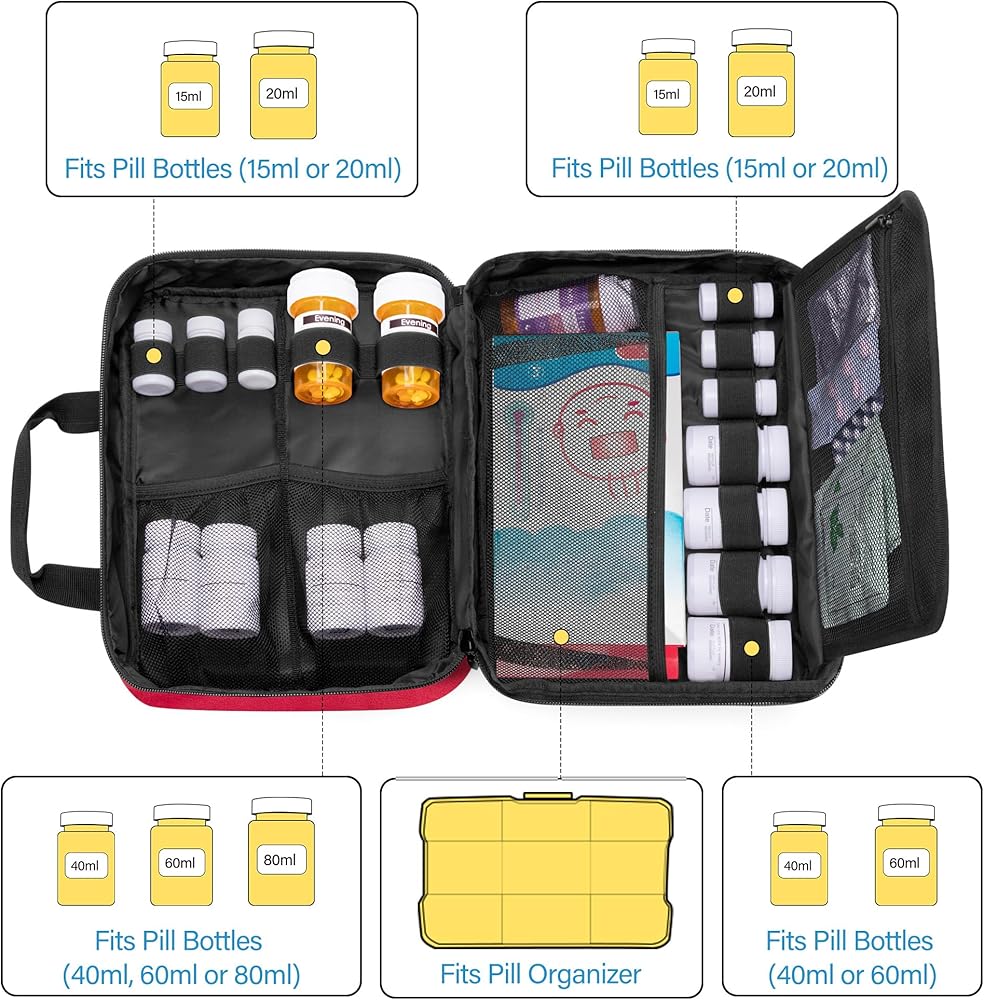PILL BOTTLE ORGANIZER: 6 small elastic loops fits pill bottles of 15ml-20ml. 4 medium elastic loops fits pill bottles of 40ml-60ml. 2 large elastic loops fits pill bottles of 60ml-80ml.