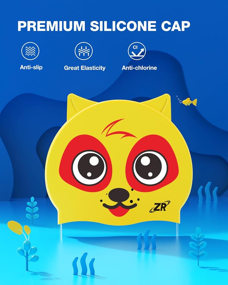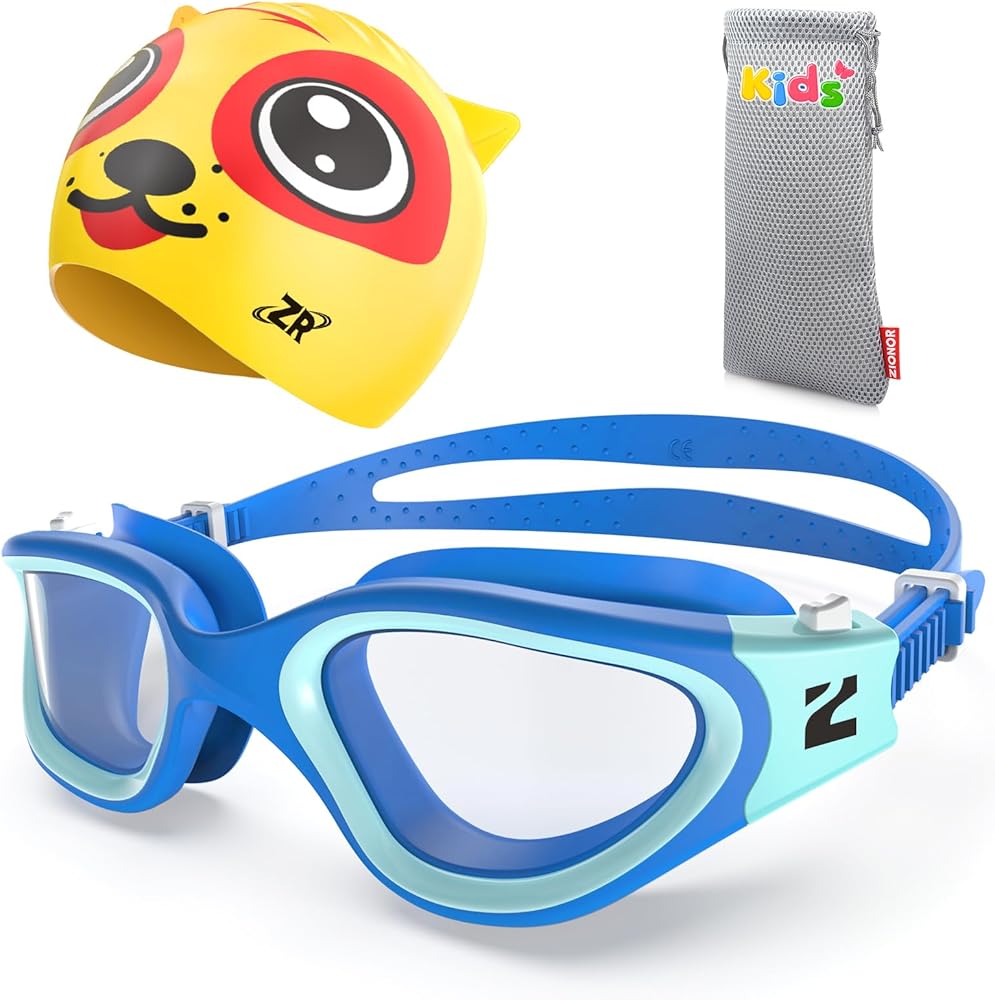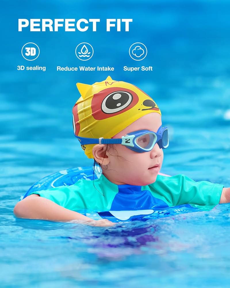 [Package Includes 1*Kids Swim Goggles + 1*Kids Swim Cap] - ZIONOR swimming goggles are made of premium silicone and polycarbonate. Silicone frame is pretty durable, soft and flexible. Polycarbonate lenses are resistant to cracking and not easily deformed. ZIONOR kids swimming caps made of eco-friendly, latex-free, non allergy silicone material. Protect your kids' hair and ear from chlorine and dirty water
