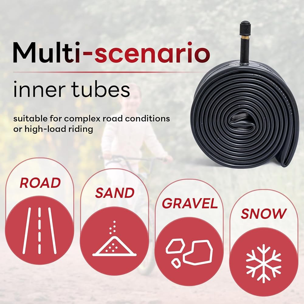 Multi-Compatibility——This 20x2.125/2.40 inner tube is suitable for most mountain bikes, road bikes, urban commuter bikes, off-road bikes and other models. Whether you are a road rider who pursues speed or a mountain biker who loves adventure, this bicycle inner tube can be your best partner.