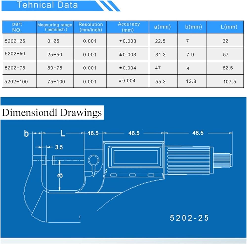 Inside Micrometers Measuring Force:5-10N Storage temperature :-20-60°C Operation temperature:0-40°C Measuring range : 0-25 mm Resolution:0.001 mm Accuracy:±0.003 mm