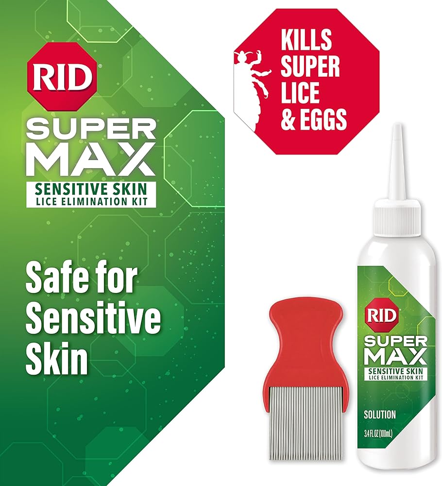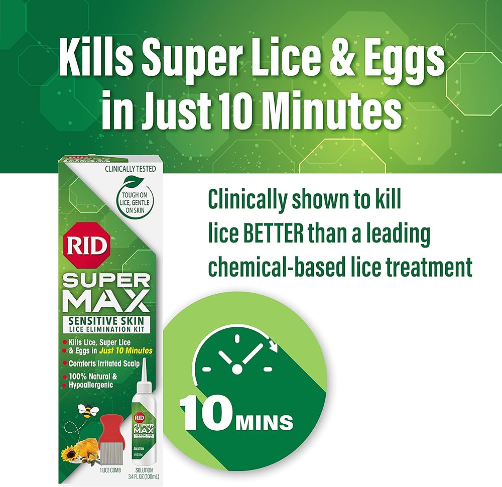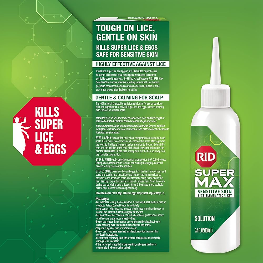 RID Super Max Sensitive Skin Lice Elimination Kit is the worry-free way to effectively kill super lice and eggs; it is tough on lice but gentle on skin. The treatment solution kills super lice and eggs without the use of pesticides found in traditional lice treatment products. This is important because a growing number of lice have developed a resistance to these pesticide-based products over the years; these lice are called Super Lice. RID Super Max Sensitive Skin's 100% lice suffocating action effectively kills these tough Super Lice and eggs in just 10 minutes. In fact, RID Super Max Sensitive Skin's unique formula is clinically shown to be more effective at killing lice than a leading chemical-based treatment. Its hypoallergenic formula is made with natural ingredients that are safe for sensitive skin, without compromising effectiveness. Plus, it helps calm an irritated scalp. It is pesticide-free, non-toxic and contains no harsh chemicals. This head lice treatment is safe for use on children 6 months of age and older. The kit includes 3.4 FL OZ solution and RID's Nit Removal Comb to remove dead lice and eggs (nits). English & Spanish instructions are included inside. (Instrucciones en espanol incluidas en el interior.)