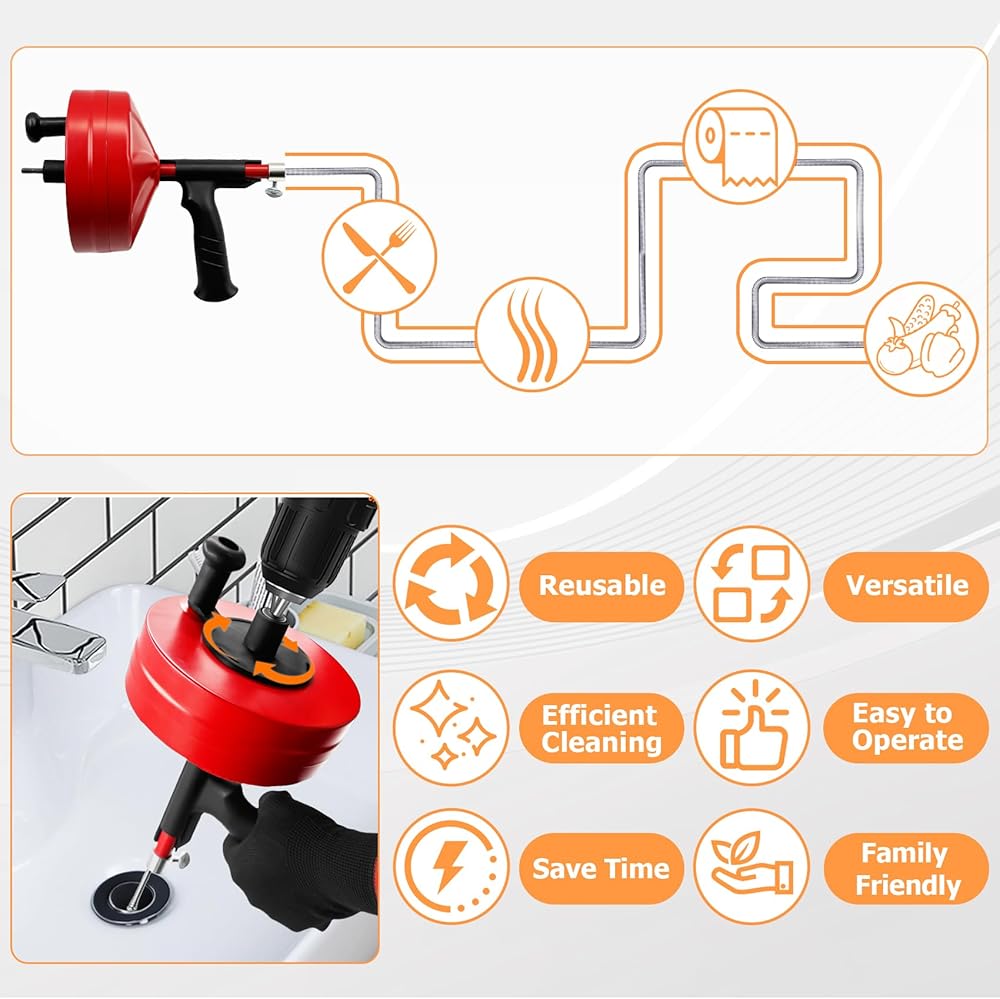 EASY TO OPERATE: Whether you're a professional or a DIY enthusiast, our drain snake can be used with ease to complete cleaning tasks without the need for special skills or training. Simply refer to the included instructions, insert the snake into the drain until reaching the blockage, rotate the handle, and effortlessly clear the obstruction. Of course, you can also use the drain snake drill attachment for added convenience (ensure the speed is below 500 RPM).