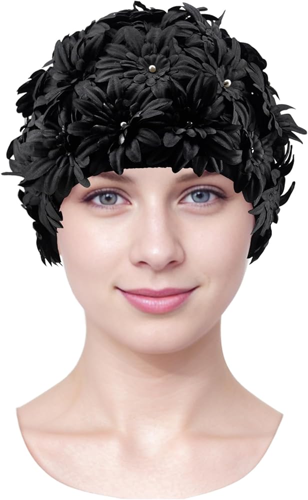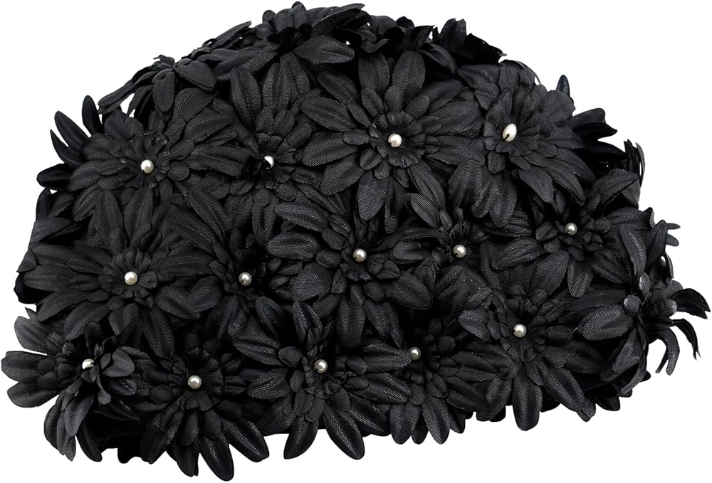 This women's swim cap features charming flowers arranged in layers all around, adorned with Pearls, which provides a beautiful, elegant appearance and a vintage style. It comes in various color options
