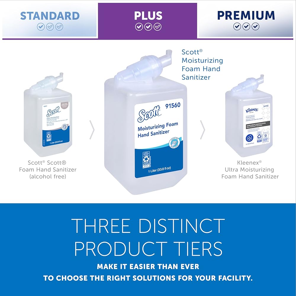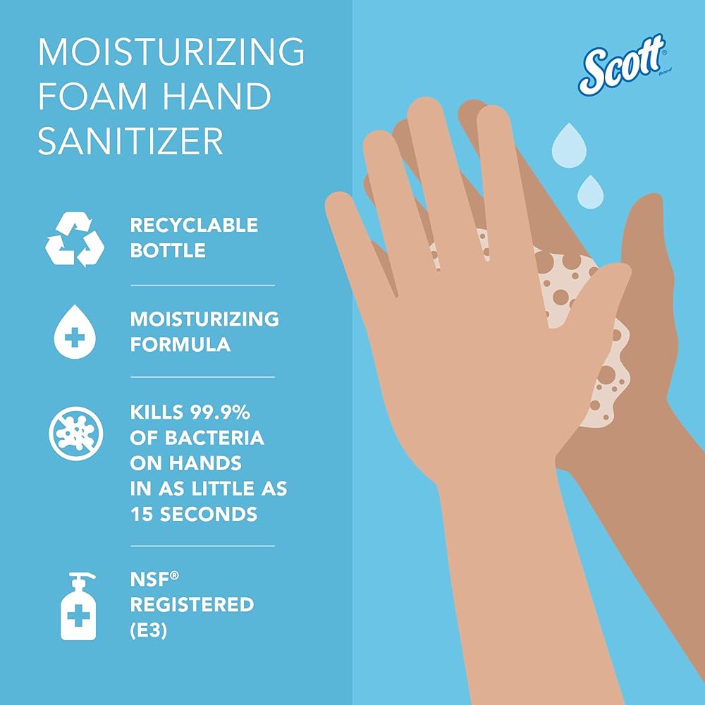 Scott® is one of the world's most recognized restroom brands with over 150 years of experience keeping your staff and guests healthy. Show you care by providing Scott® Moisturizing Foam Hand Sanitizer. It was formulated to meet the CDC guidelines for alcohol-based sanitizers and helps stop the spread of germs by effectively killing up to 99.9% of bacteria, all without the use of water. This preferred hand sanitizer solution makes it convenient for employees and guests to maintain hand hygiene and stay healthy at your facility. Scott® hand sanitizer is a popular choice for use in offices, stores, schools and more. Because the sanitizer is NSF E-3 rated, it is also suitable for use in food processing and food service settings. Scott® hand sanitizer refills maximize your productivity, while making it easy for staff and guests at your facility to stay healthy.