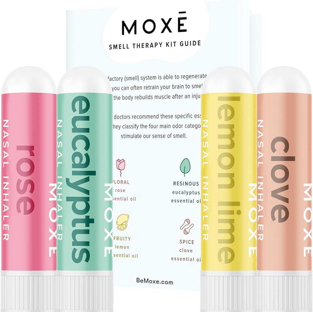 MOXĒ Smell Training Kit, Made in USA, 4 Essential Oils, Olfactory Regeneration, Helps Restore Sense of Smell, Natural Therapy for Smell Loss, Lemon, Rose, Clove, Eucalyptus, Guidebook, Personal Log