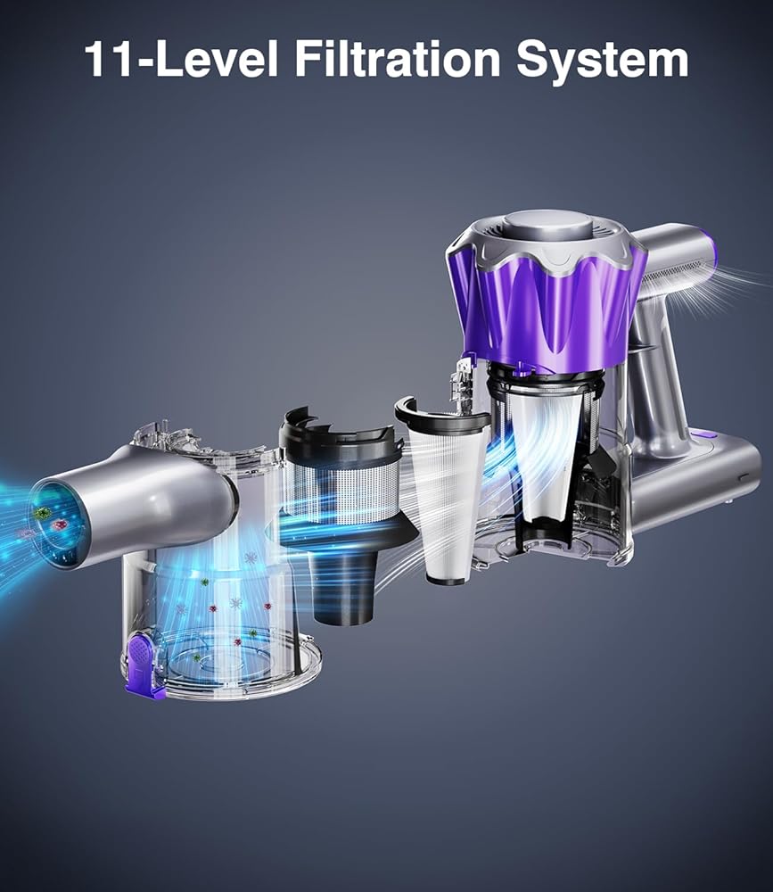 𝟏𝟏-𝐋𝐄𝐕𝐄𝐋 𝐅𝐈𝐋𝐓𝐑𝐀𝐓𝐈𝐎𝐍 𝐒𝐘𝐒𝐓𝐄𝐌: Unlike other vacuum cleaners, we focus on strengthening the filtering system with 11 levels of filtration quality, in which the extended H13 Hepa cartridge has 99.99% filtration rate. Enjoy dust-free cleaning and breathe fresh air every time you use it.