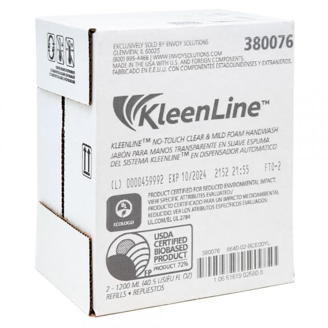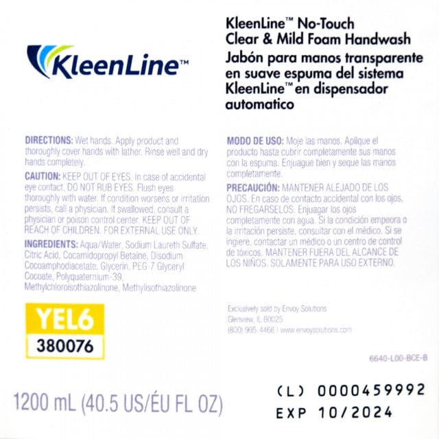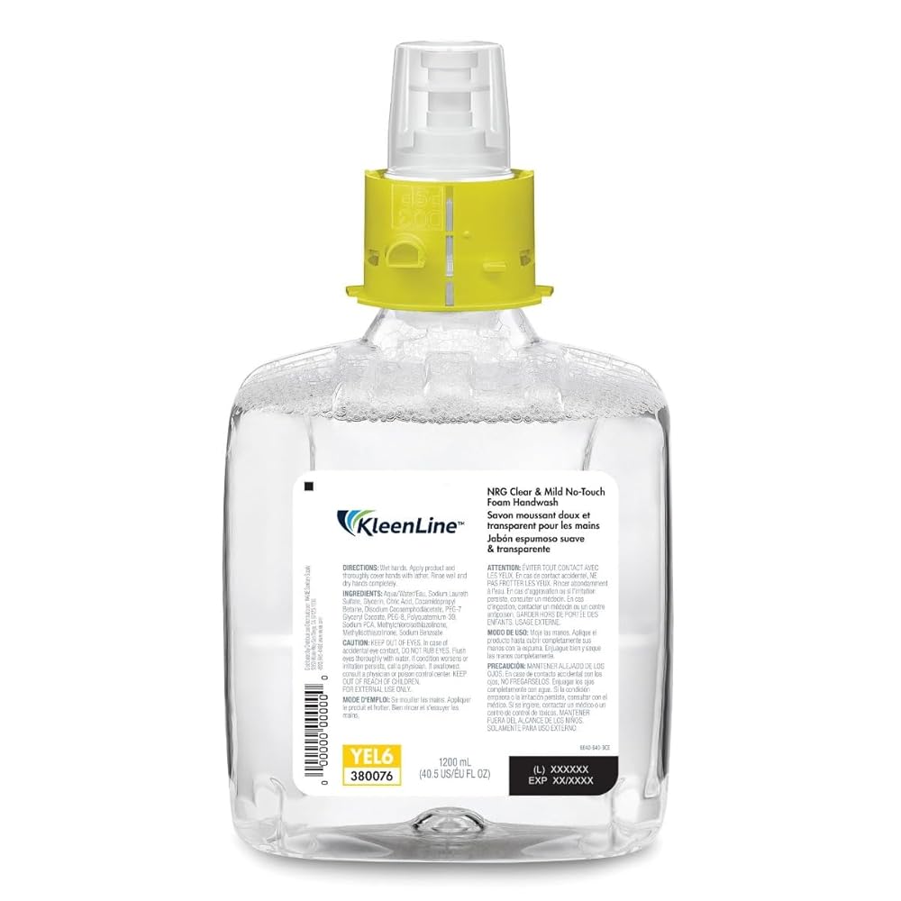 KleenLine No-Touch Clear & Mild Foam Handwash (6640-02-BCE00YL) delivers a spa-inspired handwashing experience with its luxurious foam lather. Each 1200 mL refill is enriched with moisturizers and skin conditioners, making it gentle and soothing on the skin. Designed for use in no-touch dispensers, it ensures a hygienic handwashing experience. The bottles and refills are easy to disassemble for recycling, supporting eco-friendly practices. Each case includes 2 refills, providing a convenient and sustainable solution for maintaining cleanliness and soft hands.