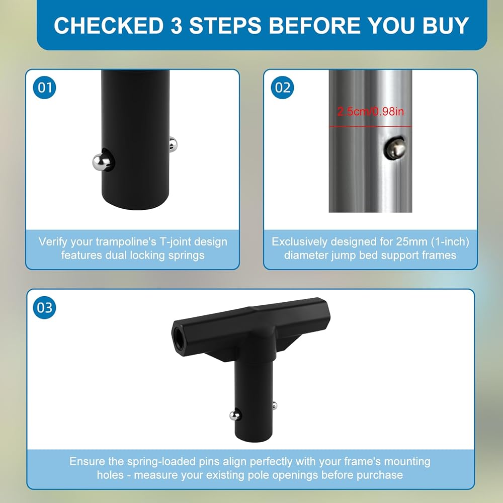 Precise 3.54"x3" Dimensions: T-connector measures 9cm/3.54" long & 7.6cm/3" high with 2.2cm/0.87" diameter tubes - compatible with most trampoline net poles.