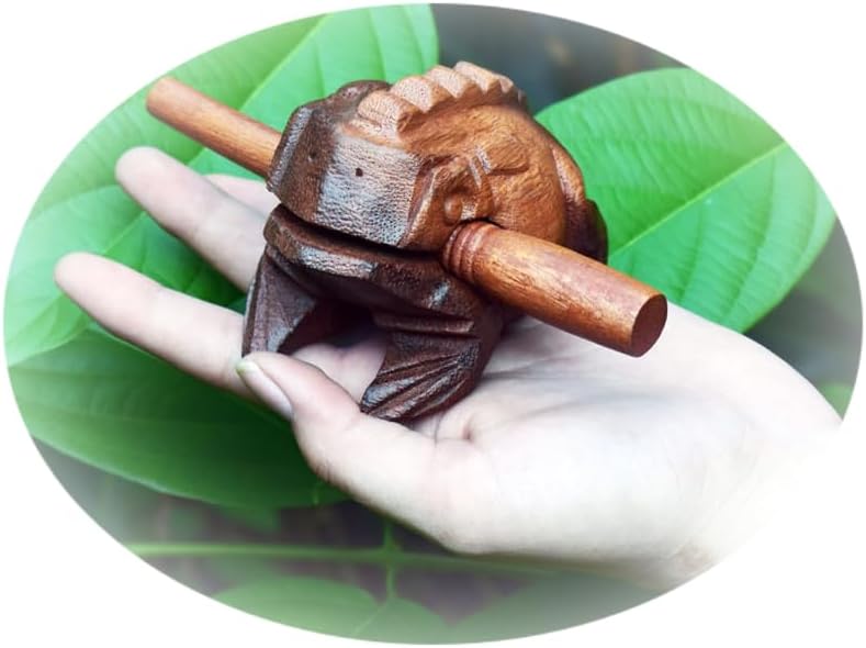 Size and material: 14.0 cm./ 5.5 in. x 8.0 cm. / 3.25 in. (measured from the mouth to the tip of the hind leg) This musical instrument is a natural wood product by drilling a hollow in the middle to make its sound. You will enjoy its fresh chime. It is a musical instrument that miraculously mimics the sounds of frogs in nature. And if you play many of them simultaneously, it will be like hearing the frog families singing in front of your front yard.
