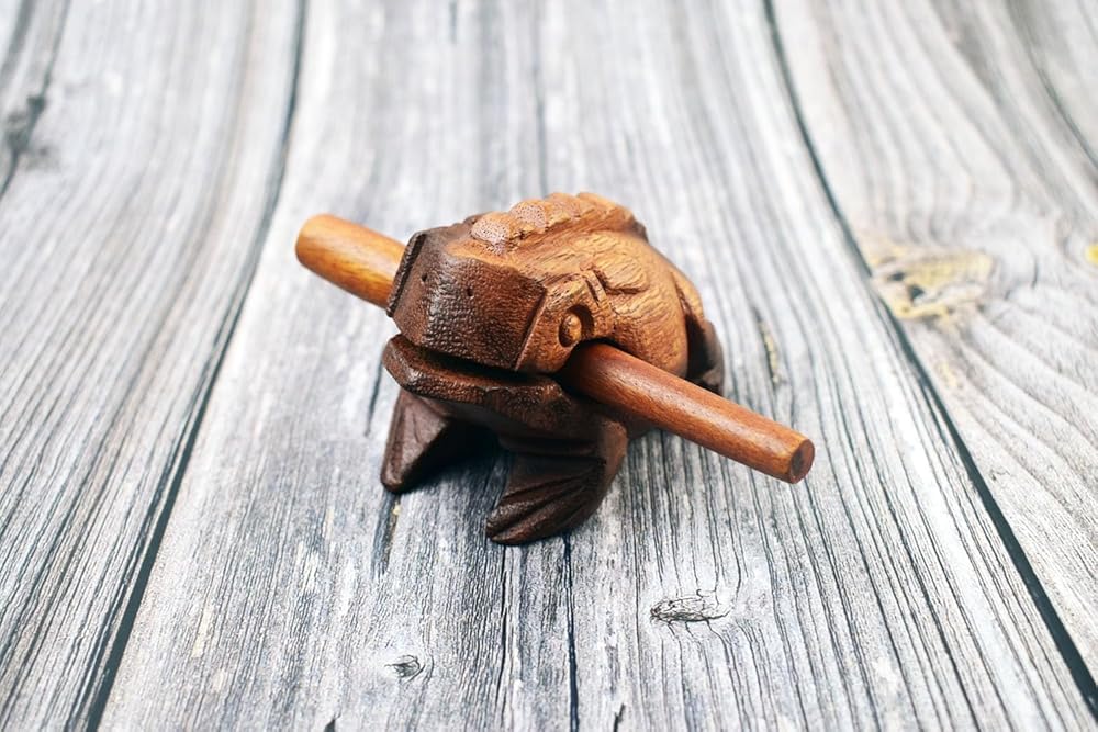 How to use: Hold the wooden frog by its front feet tightly. Use the playing stick by holding on to the tapered tip side and rubbing its back from the back to the front. If you change the tool, such as metal, plastic, or glass, the sound will change and produce different frequencies.