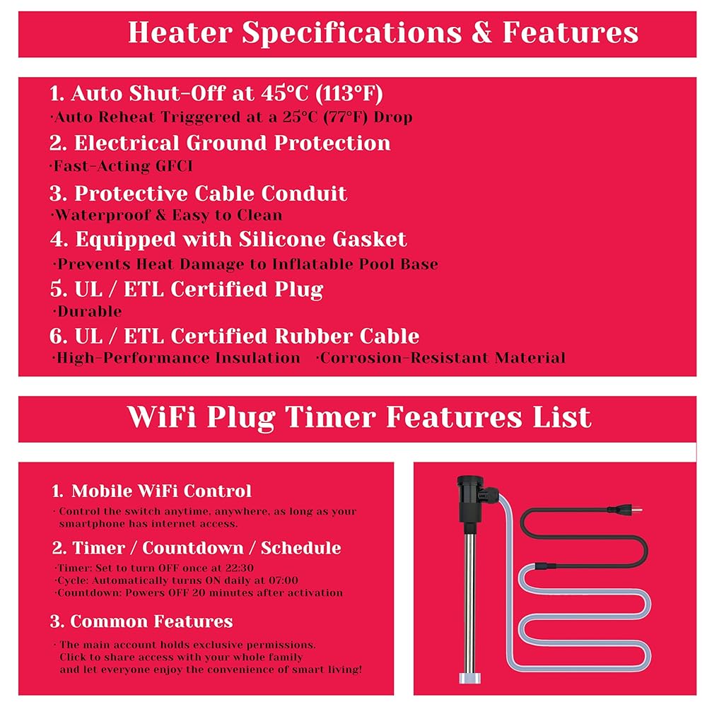 WIFI Timer والتحكم الذكي في درجة الحرارة: يوفر سخان حمام السباحة الغاطس هذا تحكمًا مناسبًا من WiFi ، مما يسمح لك بتعيين أجهزة ضبط الوقت ، والعد التنازلي ، وجداول التدفئة اليومية بسهولة. يتكيف مع روتينك للمساعدة في توفير الطاقة وتحسين الكفاءة. يؤدي التحكم في درجة الحرارة المدمجة تلقائيًا إلى إيقاف التسخين بالقرب من 45 درجة مئوية/113 درجة فهرنهايت (التسامح الإيجابي: +5 درجة مئوية (41 درجة فهرنهايت) ويعيد تشغيله بعد التبريد بحوالي 25 درجة مئوية ، مما يمنع ارتفاع درجة الحرارة بشكل فعال-لا حاجة إلى معايرة دقيقة.