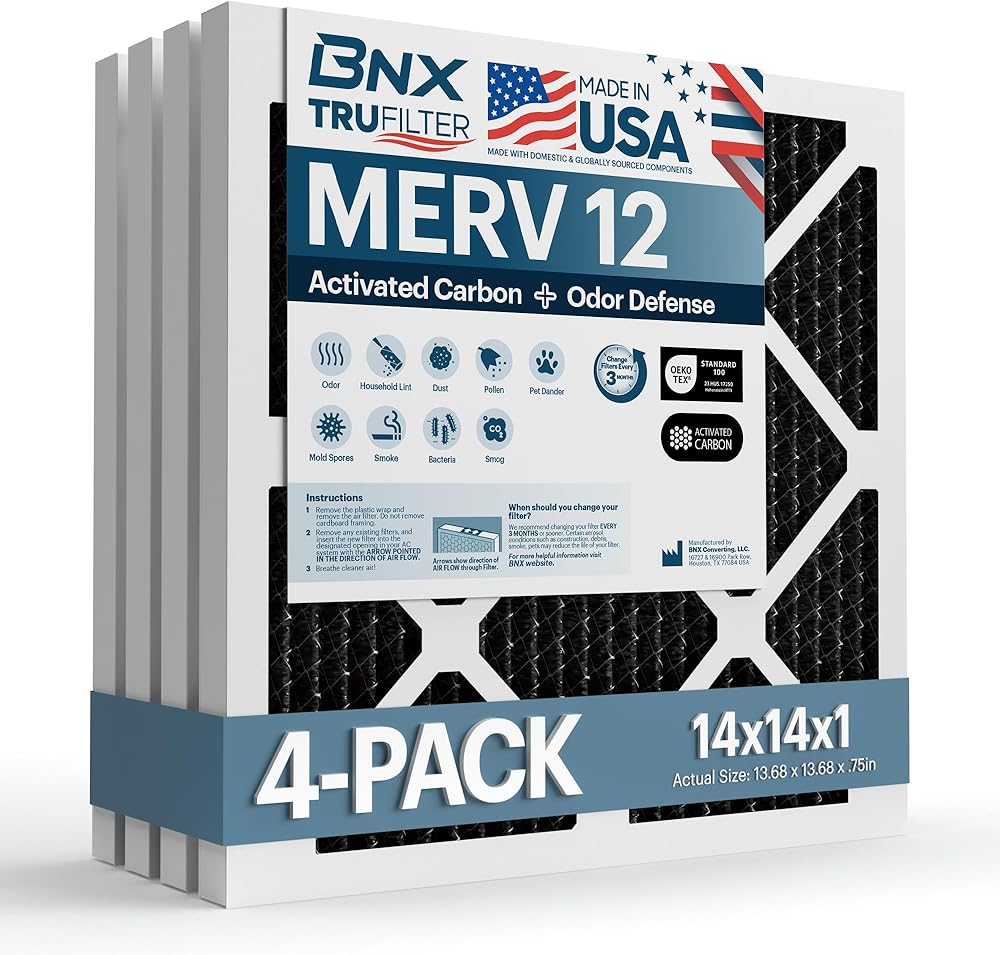 BNX TruFilter 14x14x1 MERV 12 Odor Defense (4-Pack) فلتر هواء فرن التيار المتردد مع الكربون المنشط - صنع في الولايات المتحدة الأمريكية - مرشحات فرن مكيف الهواء HVAC AC - يزيل الرائحة والعفن والبكتيريا والدخان