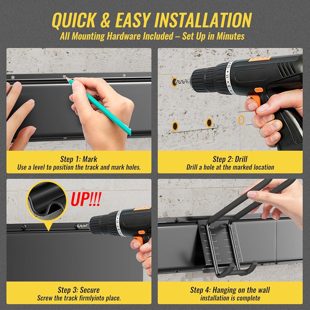 【Heavy-Duty Garage Tool Rack – 64" Rail, Holds Up to 720 lbs】Built with reinforced steel, this garage tool rack features a 64-inch wall-mounted rail and is designed to securely hold shovels, rakes, and other heavy garden tools. Perfect for any garage or garden shed.
