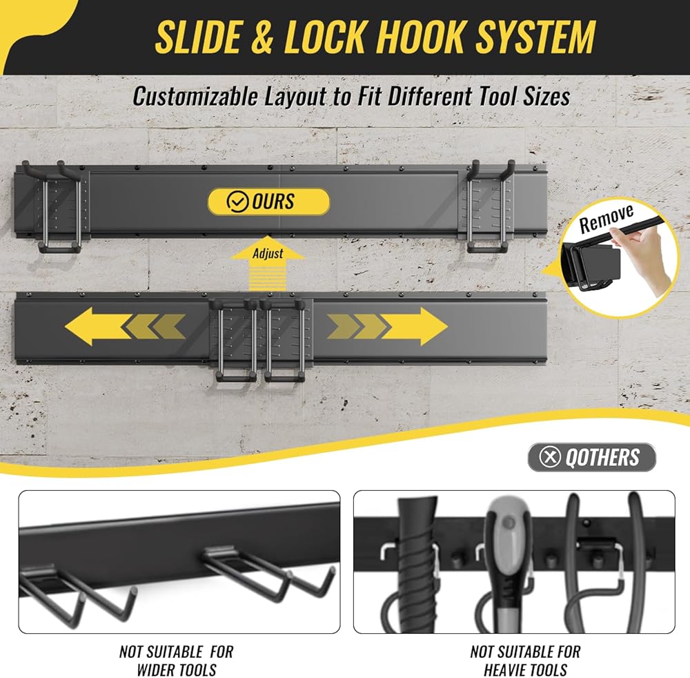 【Adjustable Hanging Hooks for Flexible Use】Includes 8 rubber-coated hanging hooks that slide and lock in place, allowing you to customize spacing for various tool sizes.
