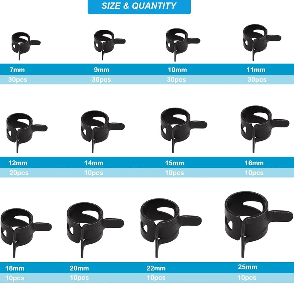 7mm, 9mm, 10mm, 11mm, 12mm, 14mm, 15mm, 16mm, 18mm, 20mm, 22mm, 25mm, all spring tube clips size packed in a sturdy convenient case, can be used for a storage box.