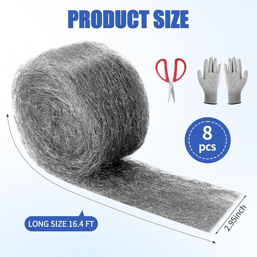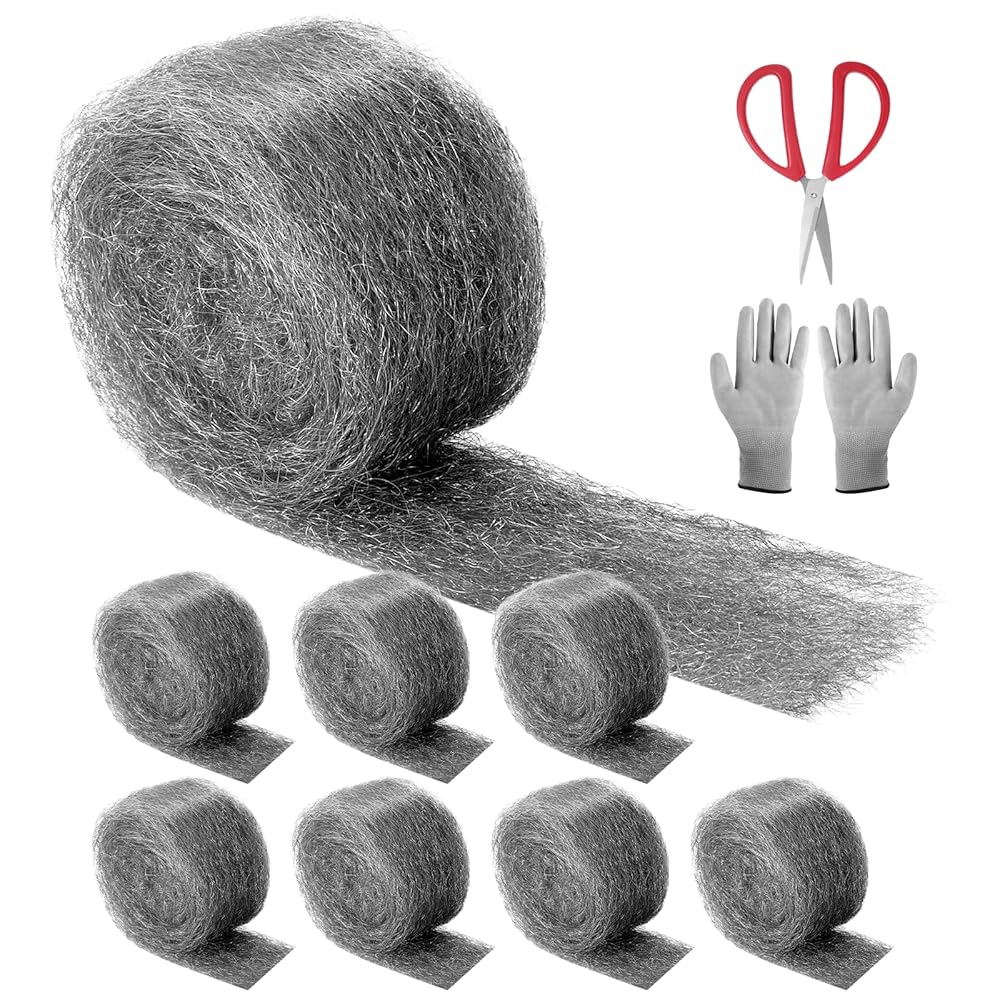 [PACKAGE AND NOTES] Eight individual 16.4 feet long steel wool pieces, a pair of gloves, a pair of scissors. Note: Please check the steel wool parts regularly and replace the damaged wire mesh roll. Please keep the steel wool pads pompoms out of reach of pets and children to avoid being cut by the steel wool pompoms.