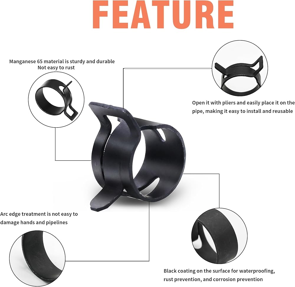 Spring band clamp kit comes in 15 sizes to meet your different needs, including 6mm, 7mm, 8mm, 9mm, 10mm, 11mm, 12mm, 13mm, 14mm, 15mm, 16mm, 18mm, 20mm, 22mm, 25mm, plus 1 piece of swivel flat band hose clamp plier, sorted and packed in plastic storage box, easy to group and organize.