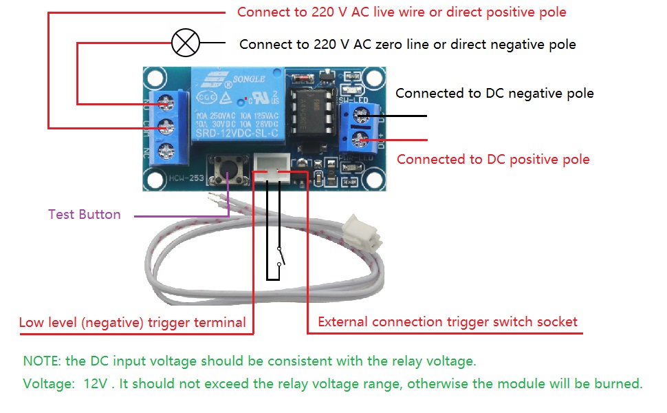 Press the trigger button , the relay is locked , press again , the relay off , you can also add the trigger switch , and the use of low-level trigger .