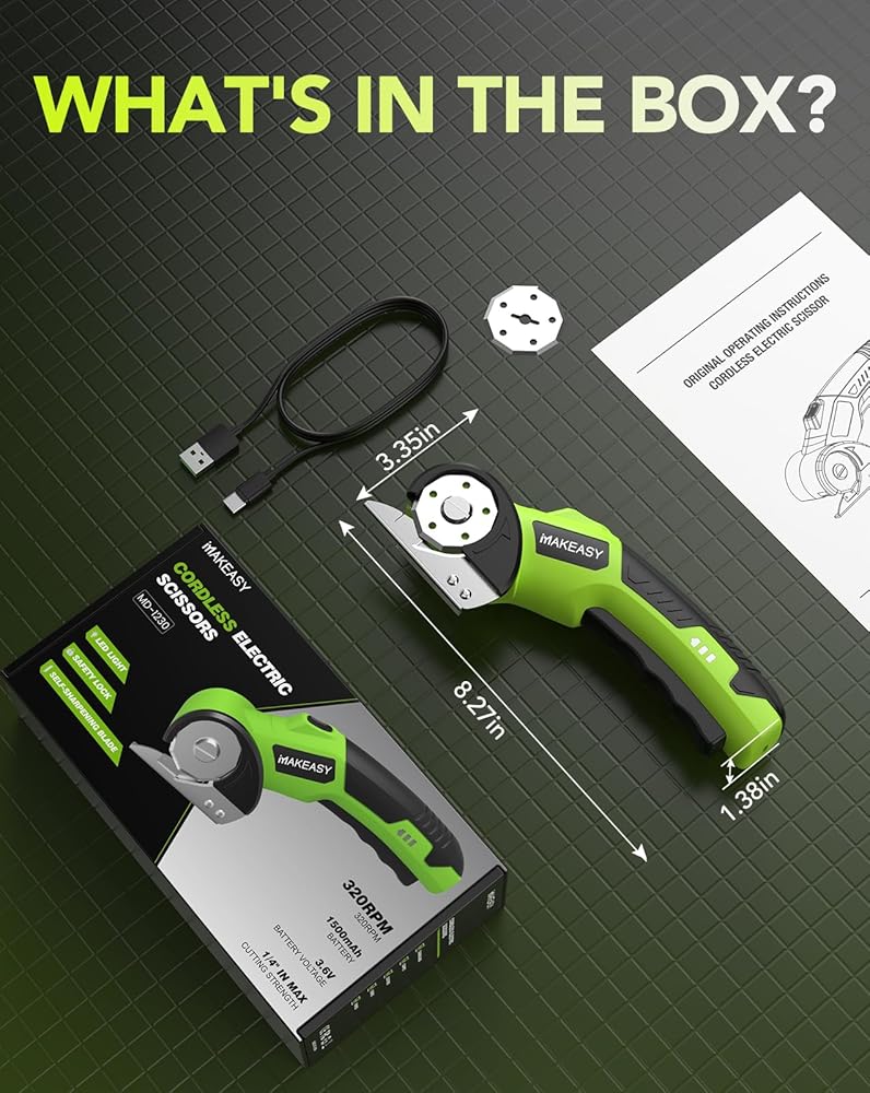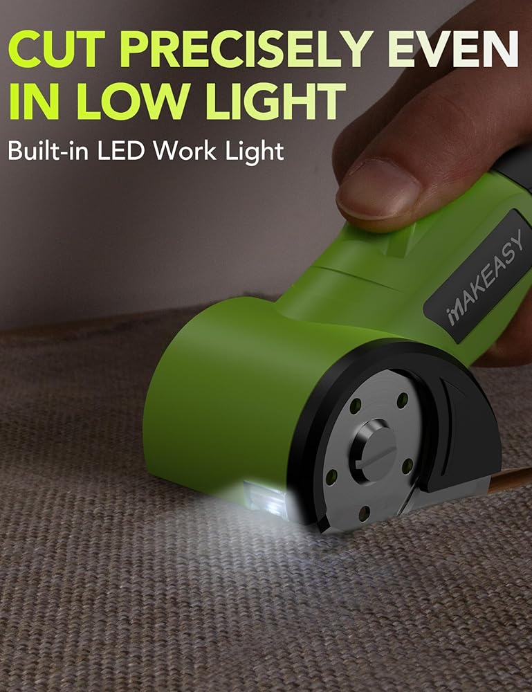 MAKEASY Cardboard Cutter, Rechargeable Electric Scissors, Box Cutter with a Replacement Blade, Rotary Cutter for Fabric, Carpet, Plastic and Leather, 3.6V, 1500mAh, 320RPM