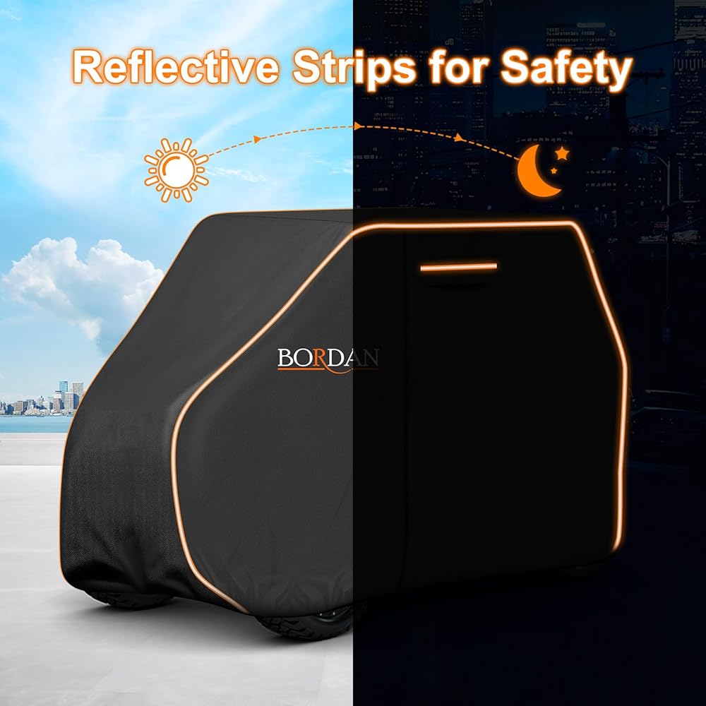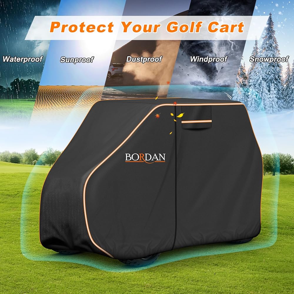 Better Material: Crafted from 600D polyester enhanced with waterproof coating. This fabric is not only thicker, more durable and tear-resistant, but also features excellent waterproof capabilities. The high-level double stitching not only adds to its durability but also ensures a snug fit. Safeguard your precious golf cart against the punishing forces of nature like heavy downpours and scorching sun.