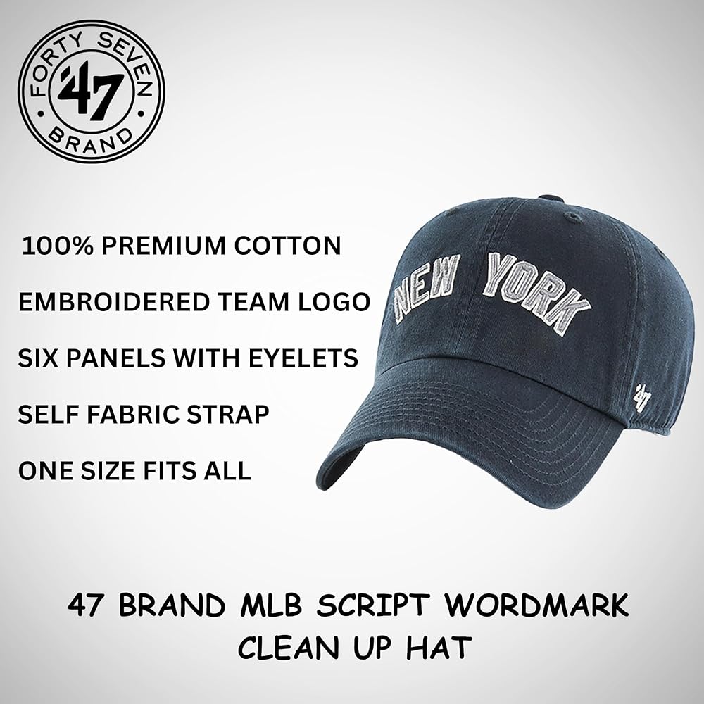 47 BRAND MLB UNISEX TEAM COLOR HOME WORDMARK SCRIPT LOGO CLEAN UP ADJUSTABLE BASEBALL CAP DAD HAT ADULT ONE SIZE FITS ALL - Step up to the plate in classic style with the officially licensed '47 Brand MLB Wordmark Script Logo Clean Up Adjustable Cap. Designed in your favorite team's signature colors, this unisex dad hat features a stylish script wordmark logo embroidered across the front, delivering a bold, vintage-inspired look that baseball fans love. Whether you're heading to the ballpark or keeping it casual off the field, this cap is a comfortable, everyday essential. Crafted from 100% cotton, this hat is soft, breathable, and built for all-day comfort. The unstructured low crown and pre-curved bill give it that laid-back, lived-in feel right out of the box. Its six-panel design with embroidered eyelets offers a classic fit with ventilation for warm days at the stadium or on the go. The back features a hook-and-loop fabric strap that makes adjusting the fit quick and easy—one size fits most adults. A woven team clip tag at the back adds a subtle finishing touch, completing the hat's high-quality construction and fan-focused design. Whether you're cheering from the bleachers or representing your team around town, the '47 Brand MLB Wordmark Clean Up Hat delivers comfort, style, and unmistakable team pride. Surface washable for easy care—just grab it and go.