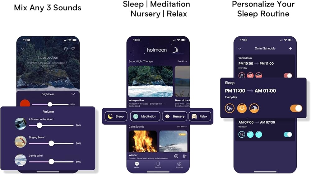 【Professional & Simple To Use】Smart Three-source hybrid sleep sound machine. 40+ Sound-light Therapy for Sleep. You can DIY any scene, any atmosphere you want. White noise ,Brown noise, pink noise, fan, brook, rain, Alpha Waves, ocean, bird and Bonfire.