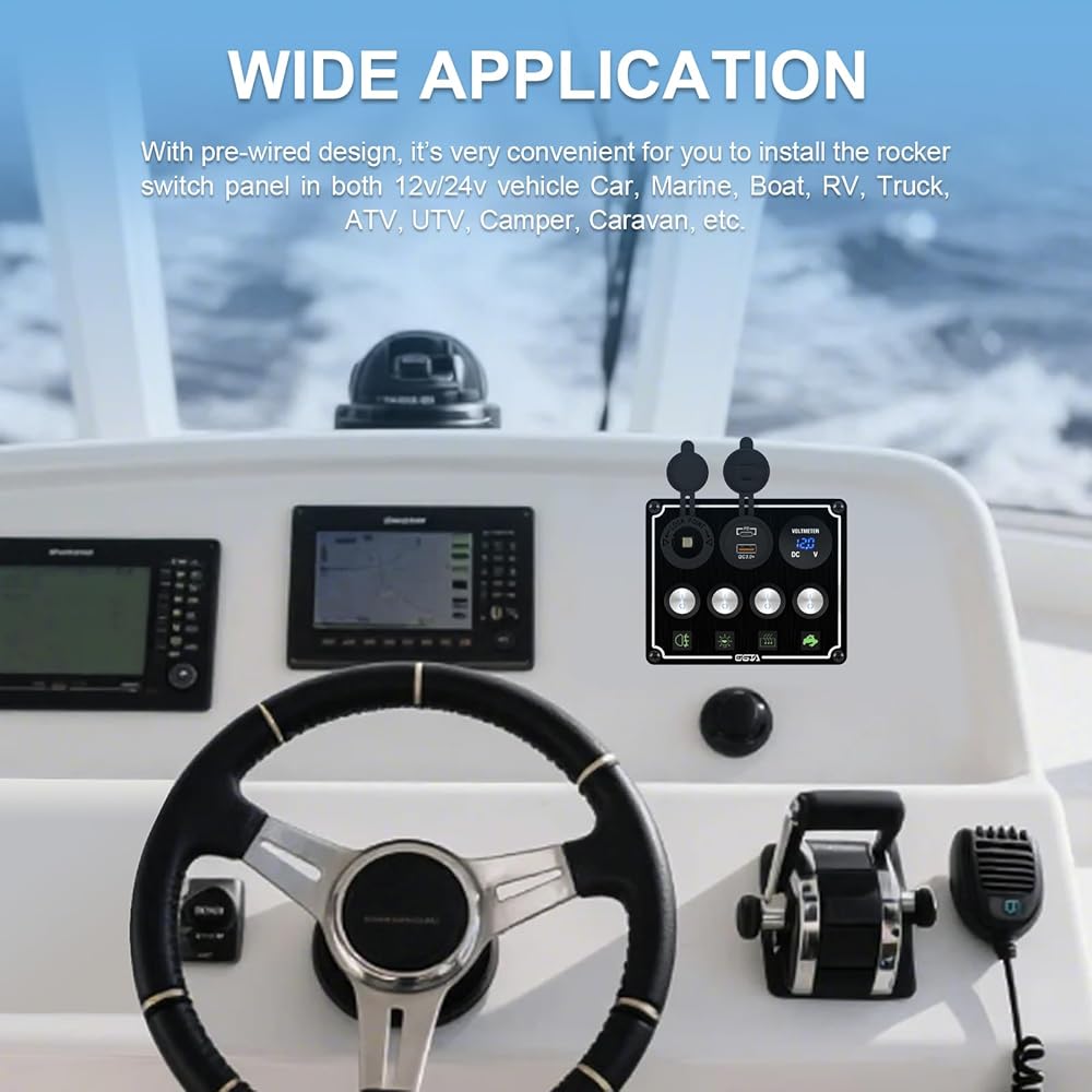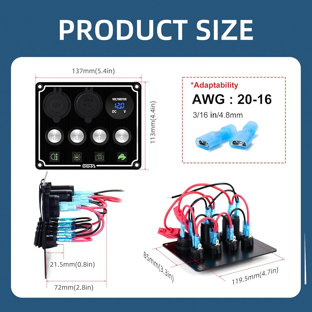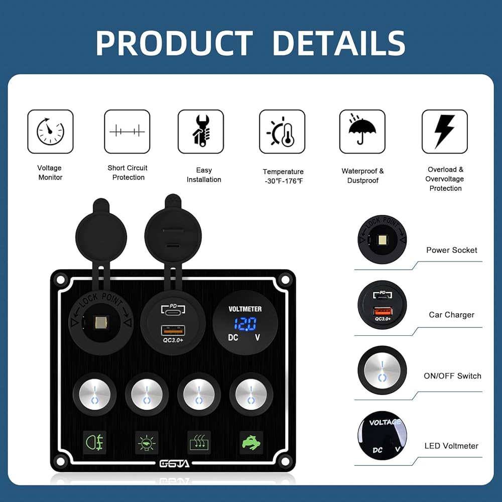 1. Multi-functional integrated design, meeting diversified electricity needs This boat rocker switch panel dual car charger tmeter cigarette lighter four-in-one design is specially designed for outdoor enthusiasts, car modification personnel, and ship users. Equipped with a 12V power outlet PD22W, Type-C and USB-A dual charging ports, supporting QC3.0 fast charging, power supply socket, and cigarette lighter meet the needs multiple devices to use electricity at the same time. Whether it is car modification, camper, mobile work vehicle, ship yacht, off-road vehicle, or truck, it can cope with it. Reliable quality is an ideal choice for outdoor electricity.