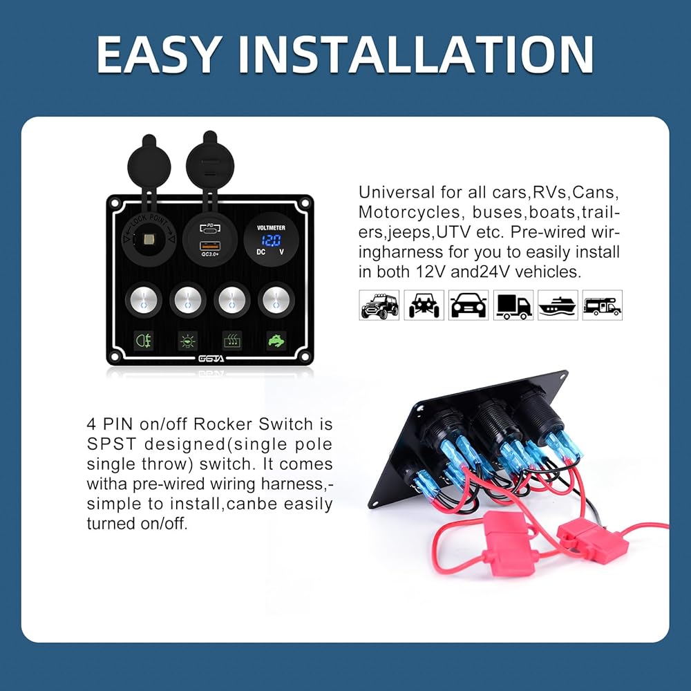 3. Multiple safety protection, more reassuring use The car charger has built-in overheating, overcurrent, overcharging, and short circuit multiple protection mechanisms, effectively preventing accidents, and ensuring the safety of electricity. Boat rocker switch panel has an IPX5 waterproof grade, dustproof and waterproof, suitable for various air environment scenarios.