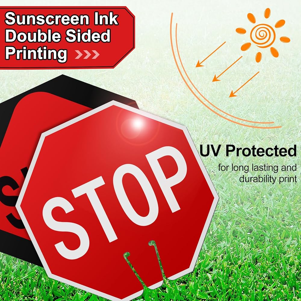 Orchestrating safety in bold hues of red, black, and white, these stop signs attract attention.