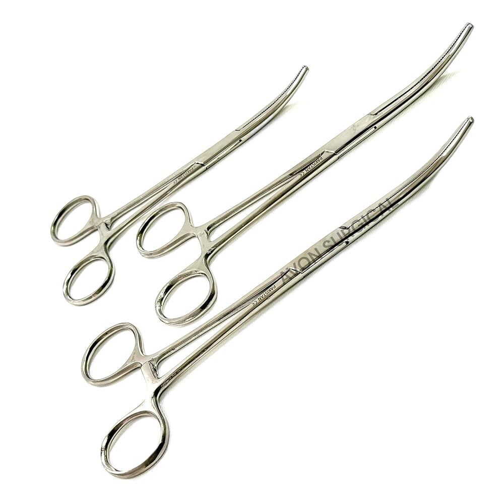 Set of 3 Pieces: Hemostat Forceps Curved with Ratchet Locking Mechanism, Serrated Tips, Includes Sizes 6" + 8" + 10" - Stainless Steel