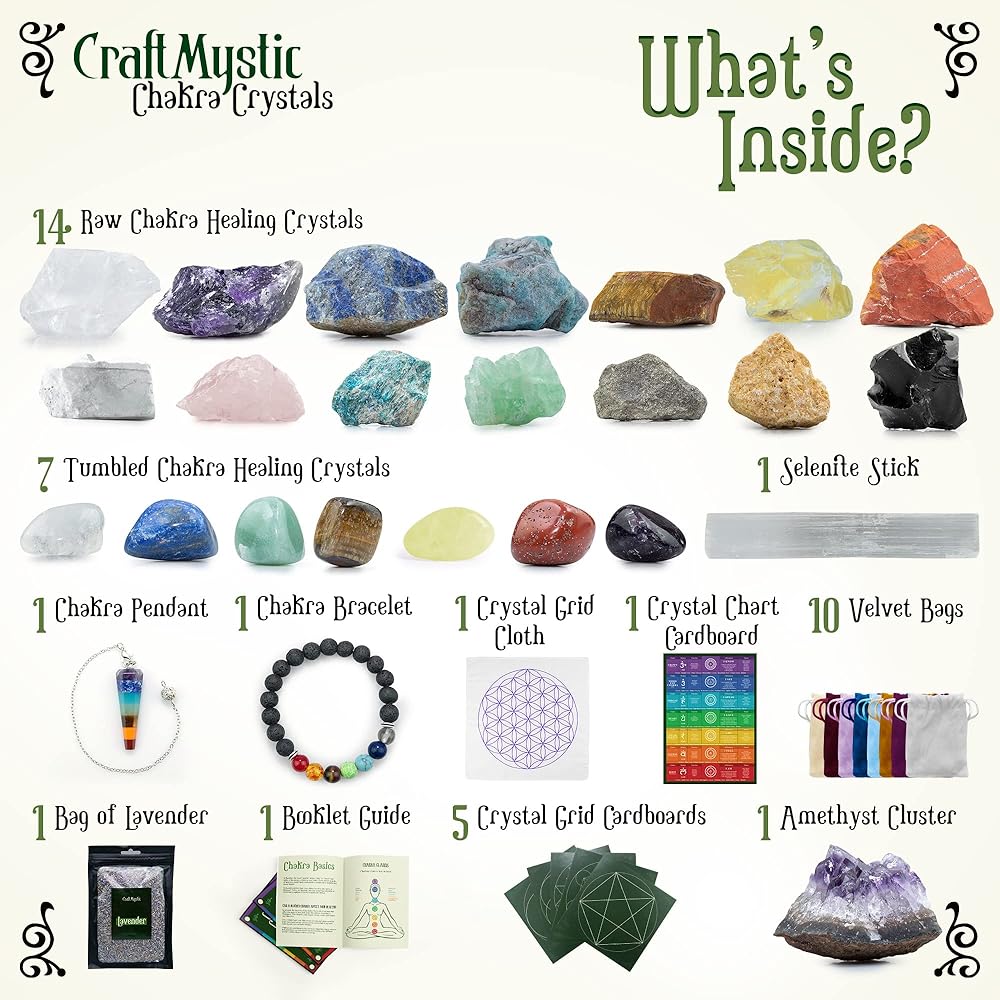 What's Inside: A 33-piece bulk pack with a wide range of applications, including tarot, balancing, chakra, and healing, designed to attract positive protection energy towards you; It includes 14 large raw healing crystals including citrine crystal, quartz 7 tumbled healing real crystals, 1 amethyst cluster, 1 chakra pendulum pendant, 1 chakra bracelet, 1 selenite stick, 1 booklet guide, 1 bag of lavender, 8 small velvet bags, 1 crystal grid cloth, 5 crystal grid cardboard, and 2 big velvet bags;