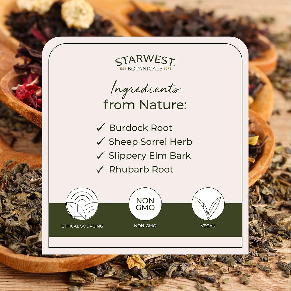 Organic burdock root, organic sheep sorrel, organic (Turkey) rhubarb root and organic slippery elm bark.