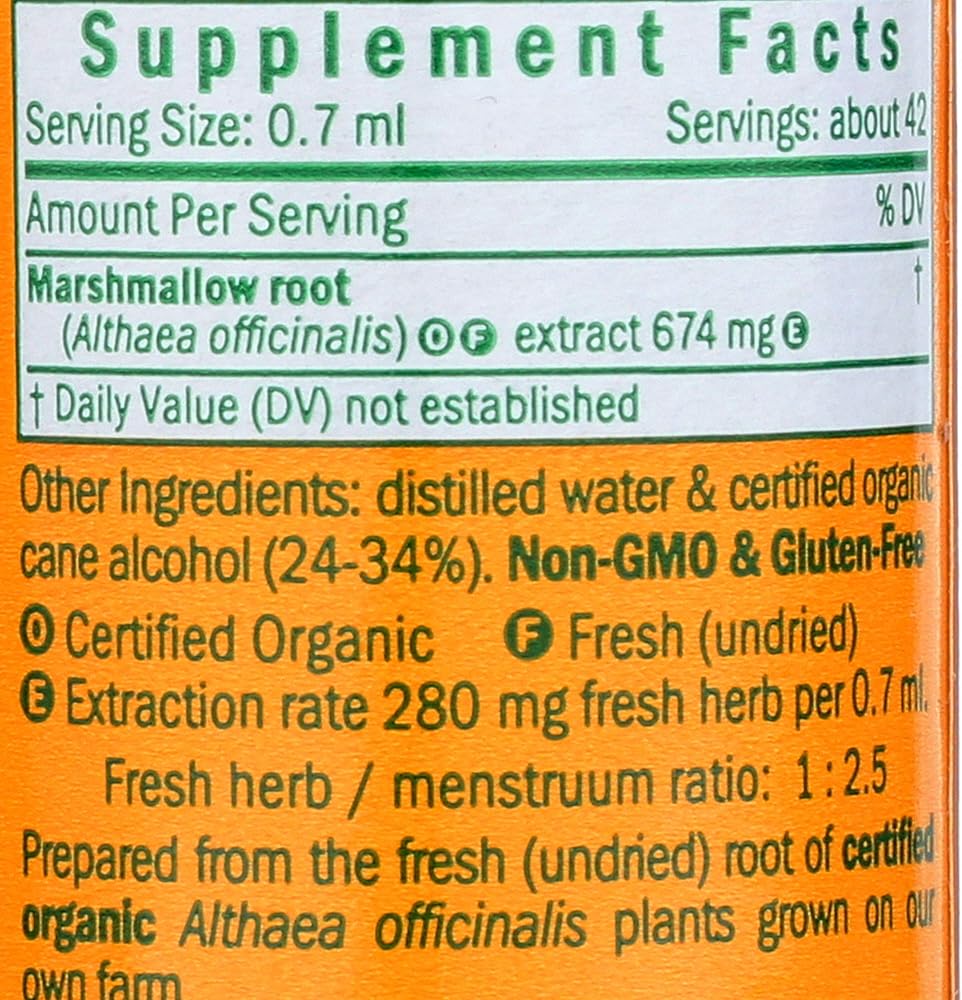 Herb Pharm prepares their Marshmallow extract from fresh (undried) roots of Althea officinalis plants which are Certified Organically Grown on their own farm without the use of chemical fertilizers pesticides or herbicides. To assure optimal extraction of Marshmallow's bioactive compounds the roots are hand dug in late autumn or early spring and are then taken directly to our laboratory and promptly extracted while still fresh and succulent.