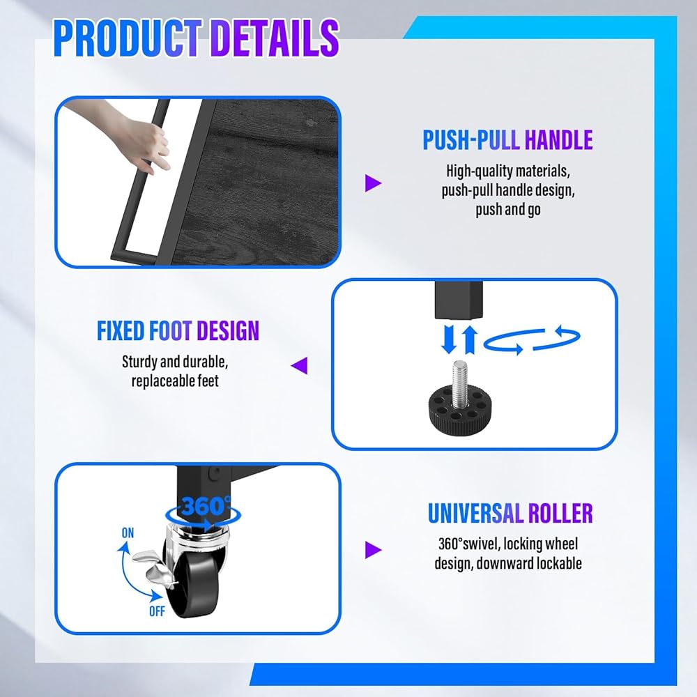 【Sturdy Storage & Smooth Mobility】The 3D printer filament stand is made of thicken metal frame and wood, surface baking paint, resists rust corrosion. 3D printer table can supports everything on the shelf firmly. The 3d printer stand with storage comes with a trolley handle, 4 wheels with brakes and 4 adjustable feets. You can easily move the filament rack to wherever you need it and lock the cart into place as needed, ensures that the stand won't accidentally move during the printing process.