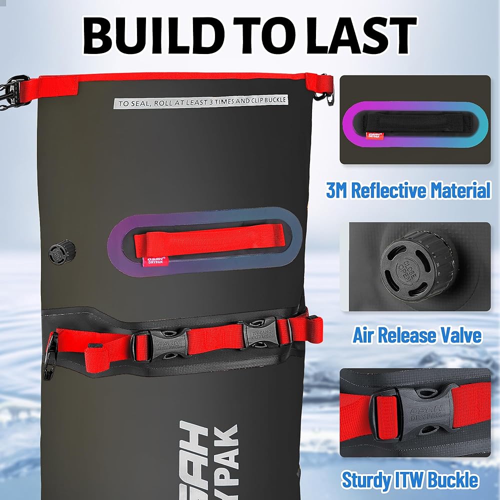 SECURE ROLL-TOP CLOSURE - Our waterproof backpack is equipped with a roll-top closure system that ensures a tight, watertight seal, effectively keeping water out. This design keeps your belongings dry, even in the wettest conditions. The roll-top mechanism also provides easy access to your items and allows you to adjust the bag's size based on your load, offering both convenience and versatility on your adventures.